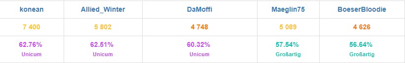 Das sind mal so die Forumskollegen mit den meisten Gefechten die mir so auf die schnelle eingefallen sind. Wobei das jetzt nur Random Gefechte sind. Etwaige Ranked/CoOp/TeamBattles/ClanBattles kommen da noch obendrauf. @konean: Nur noch ein paar Prozentpunkte