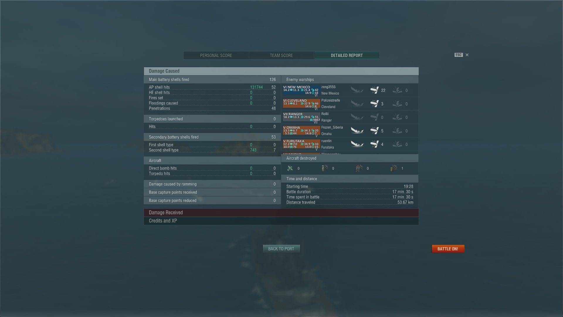 Die Geschütze sind für ein Schlachtschiff relativ genau, die Penetration gegen T6 und T7 Gegner ist anständig und im richtigen Winkel kommt man überall durch. Der Höchstschaden der AP-Geschosse liegt bei 11400. Auf 10km liegen auch mal 6 von 8 Schüssen im Ziel und bringen auch eine NewMexico ohne Zitadelltreffer zum weinen.