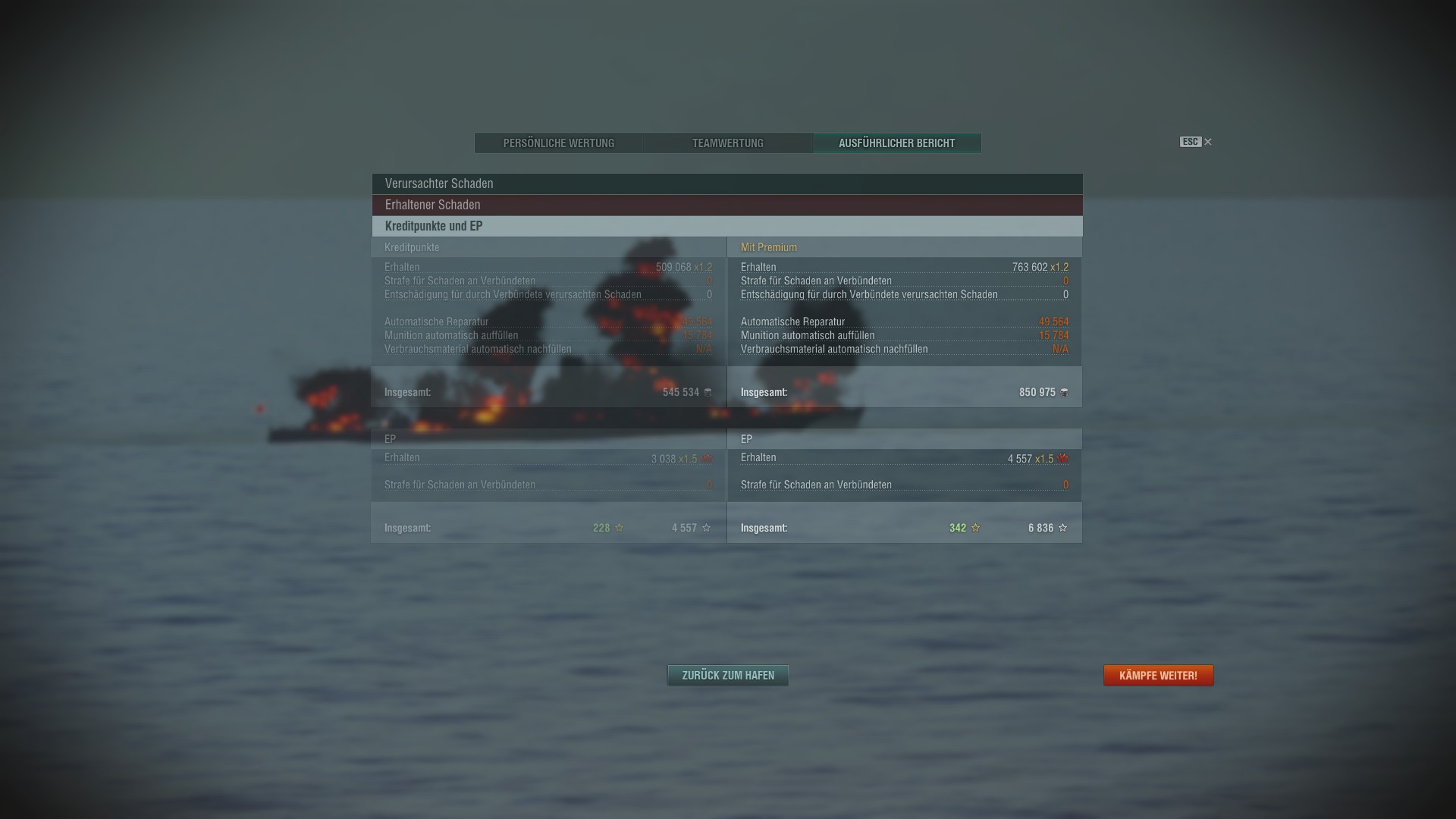 Zugegeben, die Aktion war, die restlichen Umstände betrachtend, dumm, sehr dumm, weil mich die verbliebenen 5 Schiffe in dem Eck danach böse in die Mangel genommen haben, konnte mich aber, auf dem letzten Loch pfeifend, retten und dann noch ein wenig Verwüstung stiften und die Gegner ordentlich in Panik versetzen, da sie ohne Not in alle Himmelsrichtungen davon geprescht sind und schön auf Distanz blieben, nachdem ich überlebt hatte und wieder rein gefahren bin (ich war mal wieder permanent die Frontlinie, hätten die andere Omaha und die Kuma mich begleitet, ähnlich wildes Steuerrad gekurbel vorausgesetzt, ... *sabber!*).