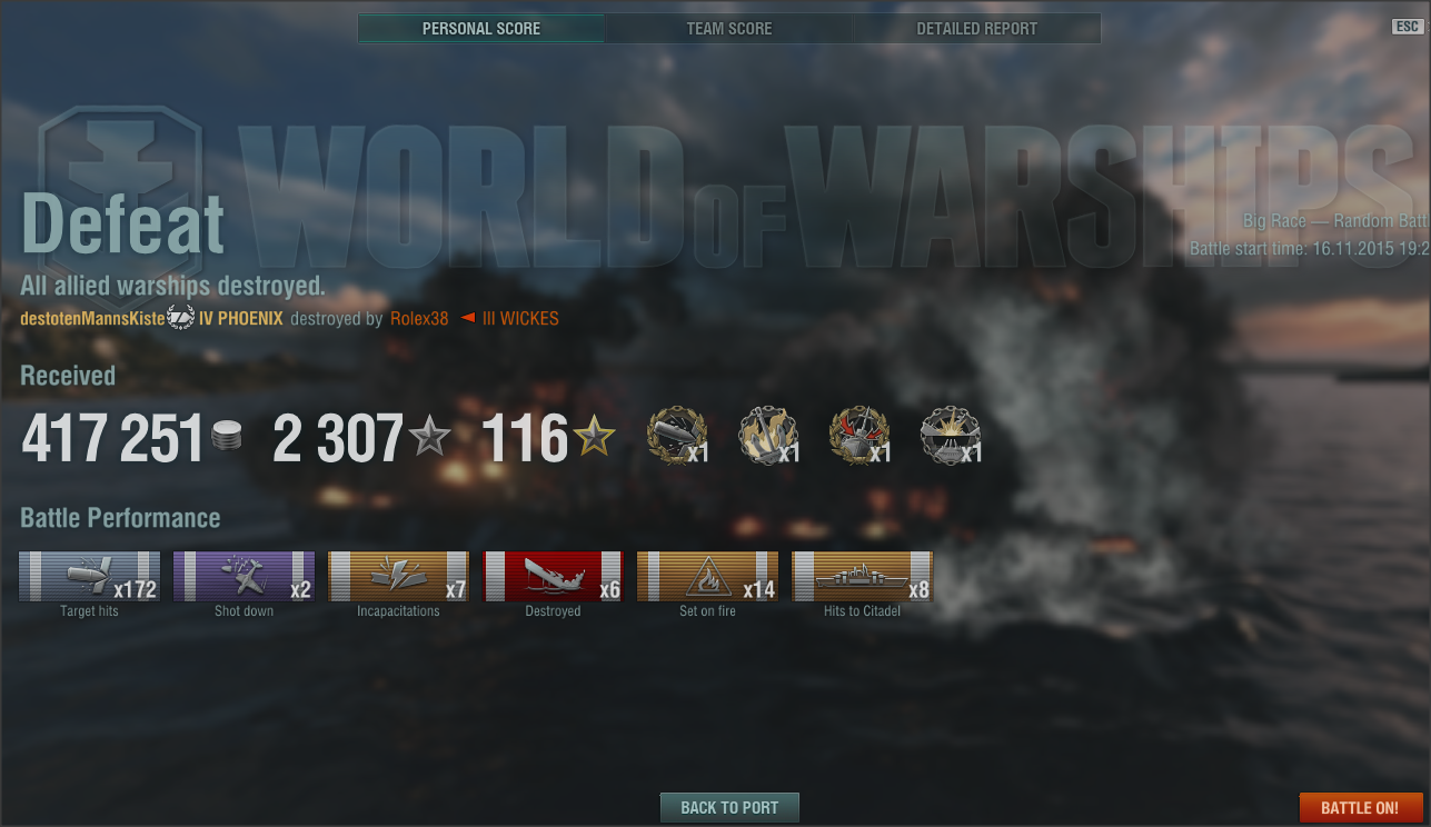 Will aber auch fair sein und muss hinzufügen, dass ich mit der Phoenix in diesen Partien nicht am Ende der Nahrungskette war, sonder schlimmstenfalls mittendrin. (erster Screenshot Drilling von letzter Nacht). Allerdings hat die Phoenix nun auch ein 20% mehr Reichweite. Von daher könnte ich mir vorstellen, dass sie auch in einem überwiegend T5 / T6 Fight nun vergleichbar gut abschneiden / besser abschneiden kann als bisher, wenn die anderen, vor allem Teamkollegen (sic! - denn das sind meine XP Konkurrenten, die Gegner sind "nur" die Lieferanten) nicht so starke Captains haben sollten.