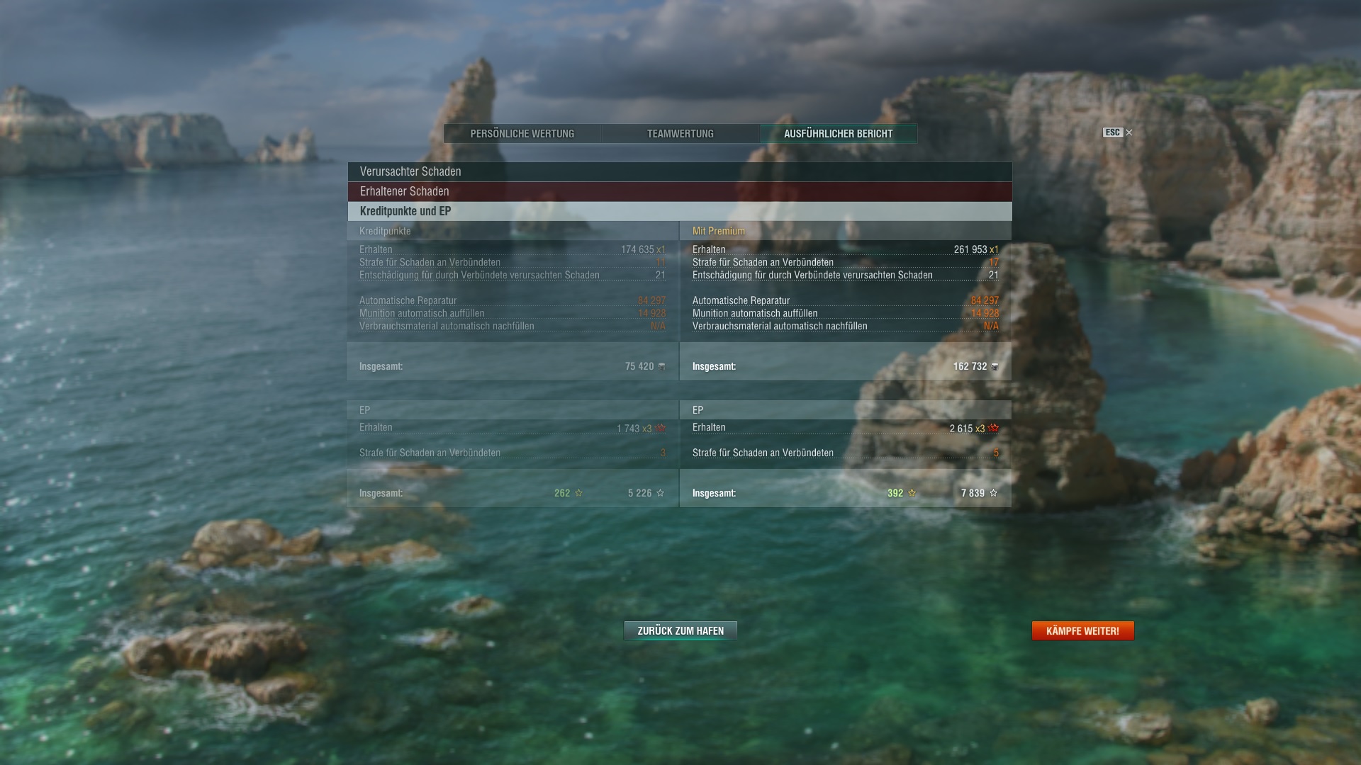 Habe das auf dem Test-Server damals auch probiert. T10 Zao mit 60K-Schaden und 2 Schiffe versenkt. Normal gute Runde, aber 60.000 Credits Minus trotz Premium-Account. Und das darf eigentlich nicht sein.