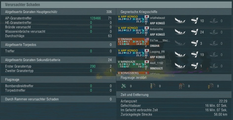 Zum Glück lief die Runde ansonsten ziemlich gut für mich und ich habe auch drei feindliche Schiffe versenkt, inklusive einem Flugzeugträger. Ich nehme mal an, dass das Verhältnis von Schaden am eigenen Team und an Feinden deshalb gut genug war, so dass ich nicht pink geworden bin.