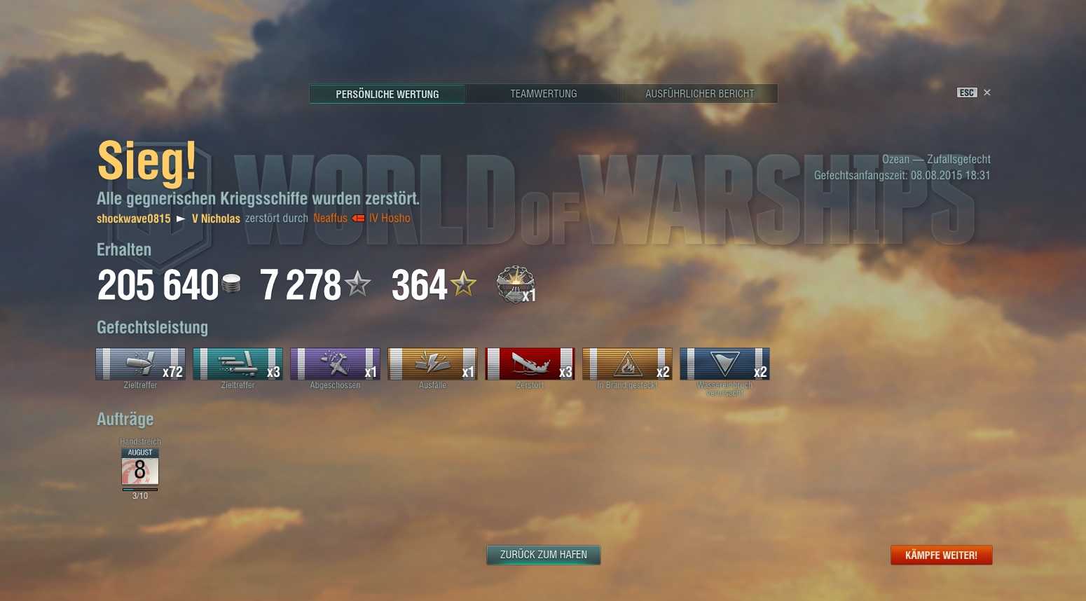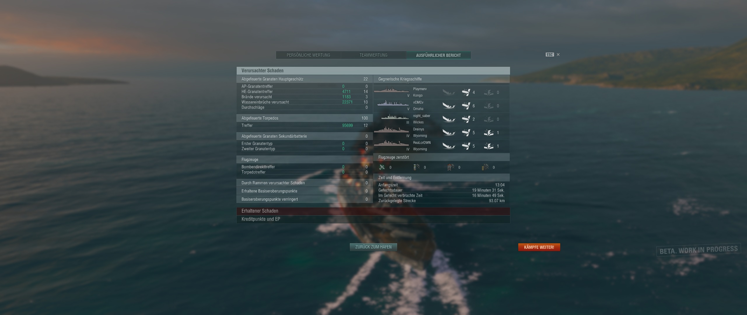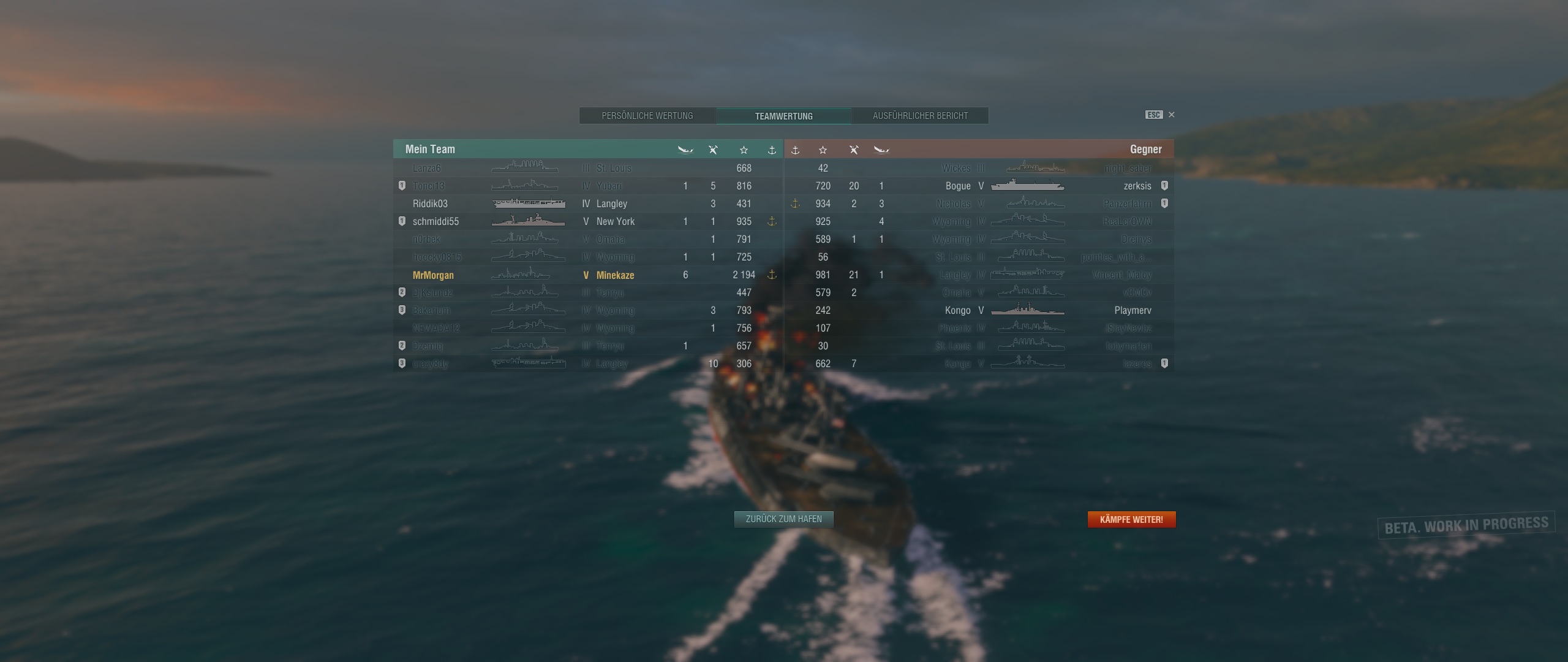 Was die Win-Quote und damit XP-Ausbeute angeht, war die für mich gestern eine absolute Katastrophe. Anfangs habe ich meistens wenigstens selbst noch ganz gut abgeschnitten und 1-3 Versenkungen hinbekommen, Basen gecapt oder verteidigt usw., auch wenn das Team als ganzes dann doch verloren hat. (Alles läuft ganz gut, bis man auf die Team-Anzeige schaut und plötzlich merkt, dass man nur noch 3 gegen 9 ist.