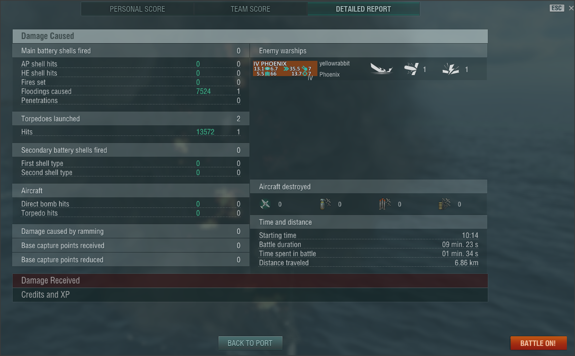Von eurer eigenen Torpedo Salve (2 Torpedos) trifft dann auch noch einer die Phoenix, sie rept nicht (wohl schon verbraucht), läuft voll, säuft ab, ihr holt einen "It's just a flesh wound" und "First Blood". Habt das Gefühl, nein, die Gewissheit(!), nach diesem ersten und einzigen Kill mit nur einer Salve, nur einem Treffer, dass das eure Runde geworden wäre, dass da noch richtig viel gegangen wäre...
