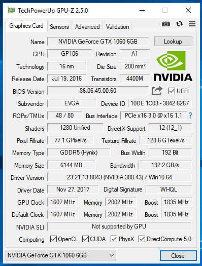GPU: EVGA GeForce GTX 1060 SSC Gaming ACX 3.0, 6144 MB GDDR5