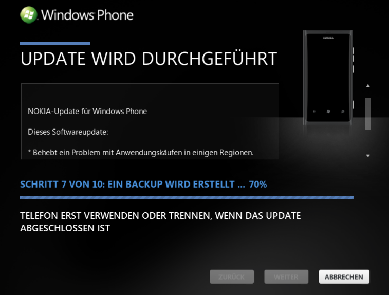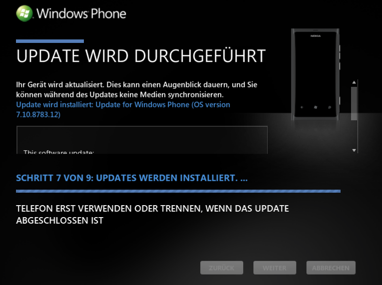 Handy per USb mit PC verbinden > Flugzeugmodus aktivieren > Zune auf Telefon > Einstellungen > auf aktualisieren > Updates werden gesucht, > sofort das LAN Kabel kappen > Updates wurden gemeldet. ( 2 x wiederholen im Anschluss an das jeweilige Update).