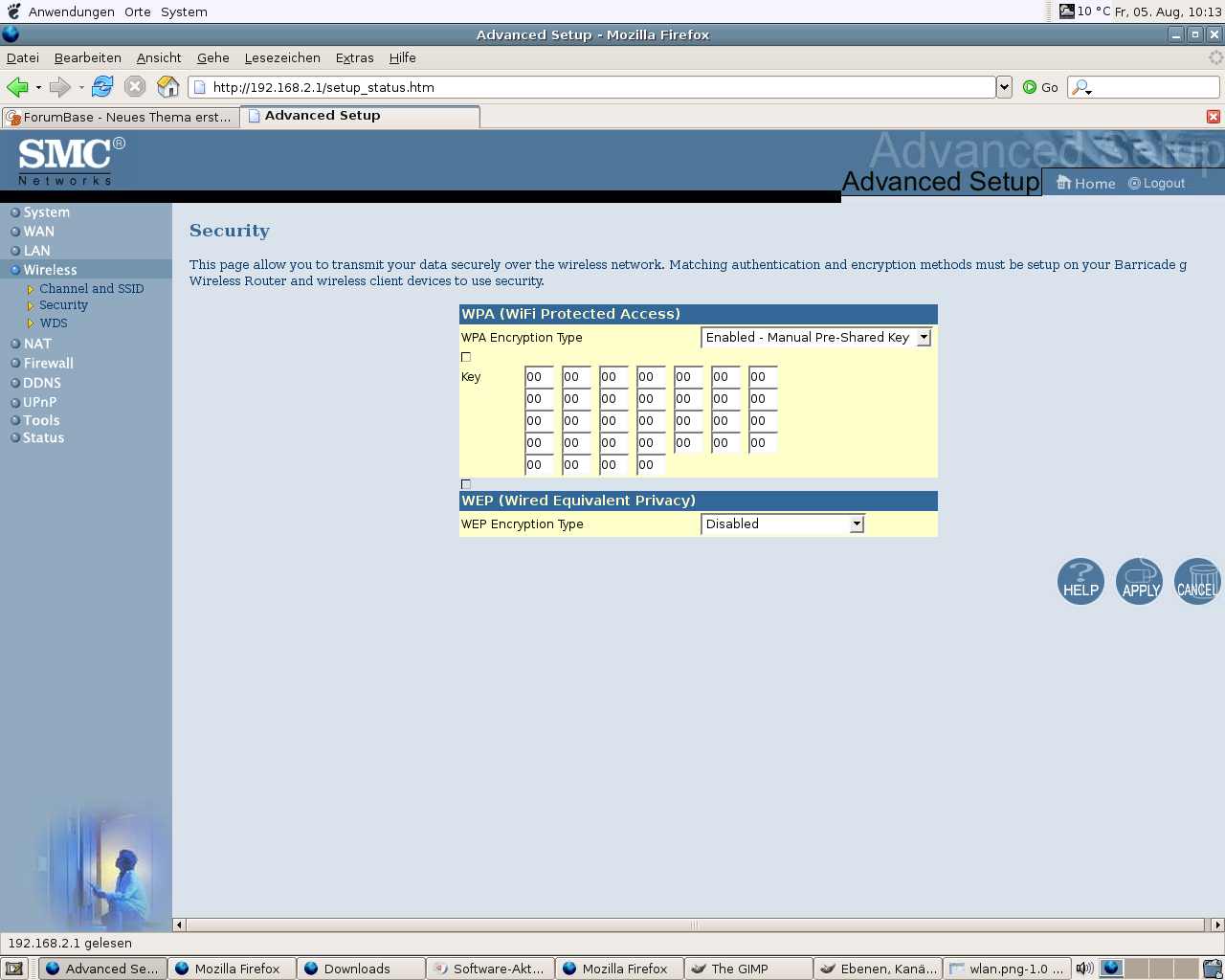 Da ich jetzt eine W-LAN Karte für den Rechner von meinem Bruder gekauft habe, wollte ich die W-Lan Funktion von unserem Router aktivieren, und das Netzwerk entsprechend gegen unbefugten Zugriff absichern. Da mein Router WPA unterstützt wollte ich das natürlich verwenden, da es deutlich sicherer als WEP ist. Allerdings blicke ich noch nicht ganz durch die Konfiguration des Routers durch. Man kann nämlich WPA und WEP gleichzeitig aktivieren, was doch irgendwie keinen Sinn ergibt. Normalerweise müsste es doch ausreuchen, wenn ich Nur WPA aktiviere, und da einen entsprechenden Hexadezimalcode eintippe oder muss wep auch eingerichtet sein?