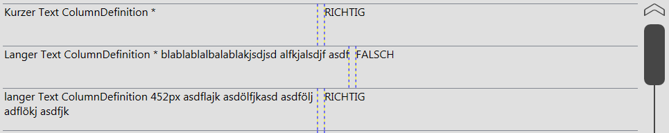 Was nicht klappt ist folgendes: Wird der Text länger als der zur Verfügung stehende Platz, soll der Text umschlagen. Allerdings wird die Breite der Spalte vergrößert. Lege ich die Spaltenbreite fest (also statt Width="*" z.B. Width="400") dann wrapt der Text. Ändere ich aber die Auflösung muss ich wieder alle Werte anpassen. Hat mir da jemanden einen Tipp?