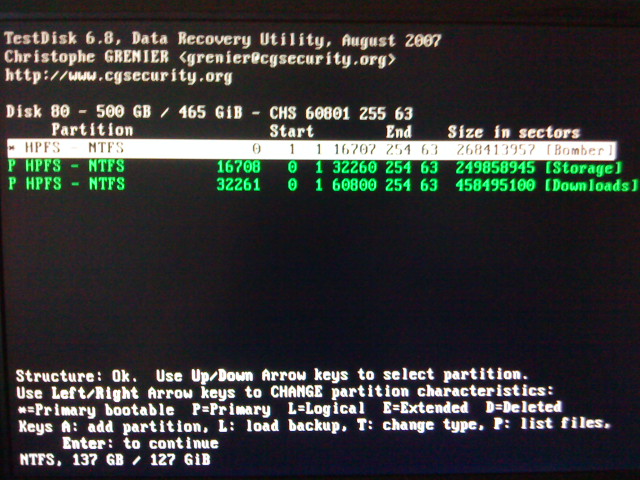 Markiere mal deine zwei Partitionen nacheinander und drücke p ob deine Daten oder eine Fehlermeldung angezeigt wird.