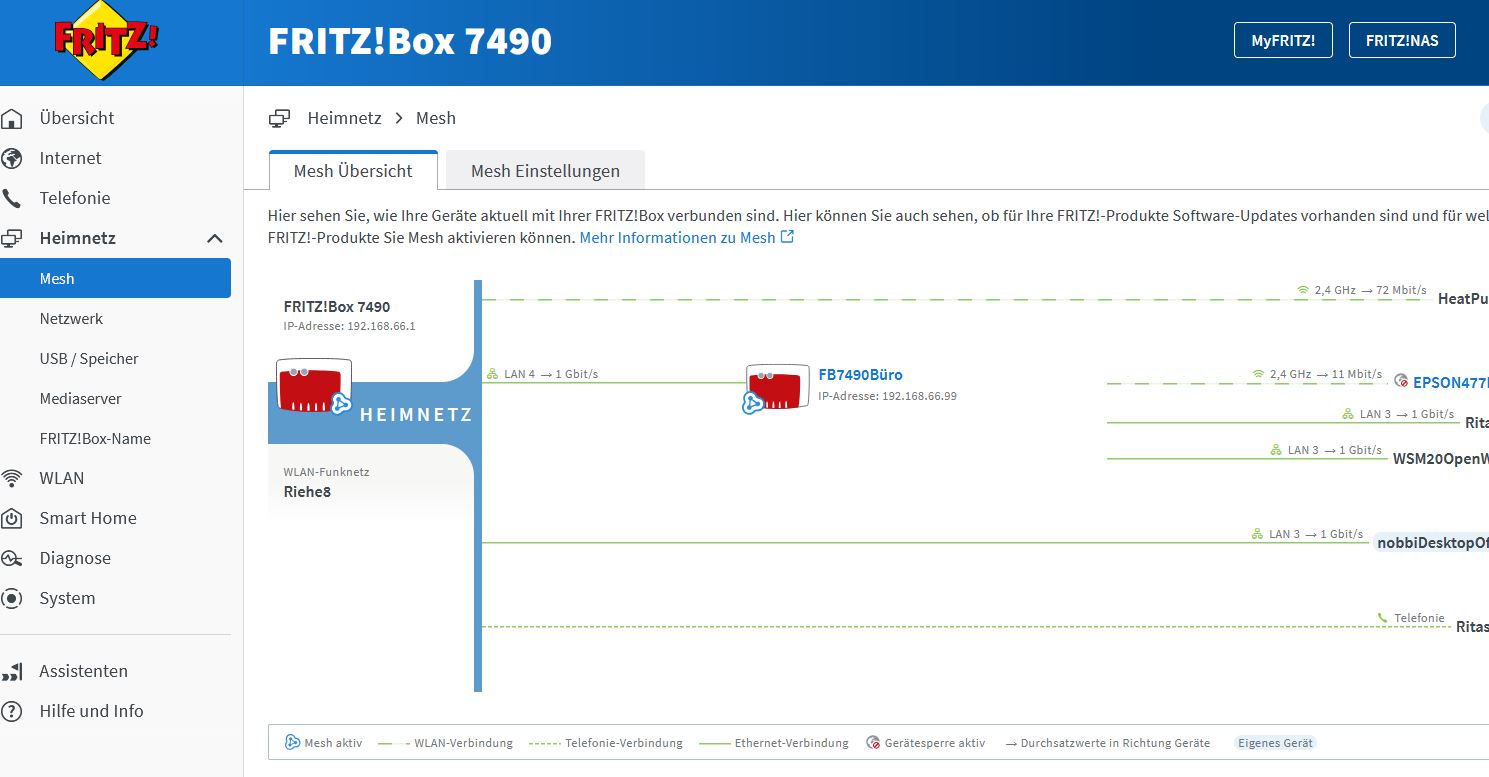 Die FB7490Büro da war das WLAN ausgeschaltet. WLAN kam über WSM20 OpenWRT, weil Wifi6, k5 + k100. Der Router FB7490 steht im EG ca. 10m entfernt, k1 +k112. Zugang 1&1 170Mbit über ONT.