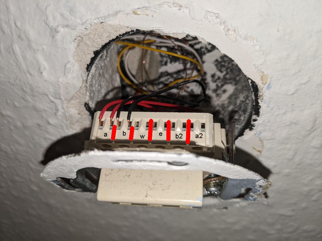 Nun habe ich mal eine dieser Dosen im OG geöffnet, um die Verkabelung zu prüfen - und hätte hier eine klassische Reihenschaltung (La -> a2 und Lb -> b2) erwartet - fand aber etwas ganz anderes vor: rot1 auf La, rot2 auf Lb, schwarz1 auf W, schwarz2 auf W. Siehe Bild im Anhang. Hmm.