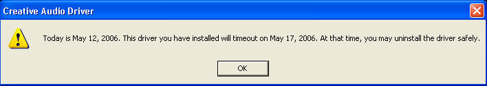 Genau diese Fehlermeldung kommt bei mir auch, sie heisst eigentlich übersetzt, dass der installierte Treiber am 17.Mai ausläuft und du ihn dann deinstallieren musst. Hoffe Creative stellt bis dahin einen neuen Treiber und Software zur Verfügung, ist sowieso schon längst überfällig!
