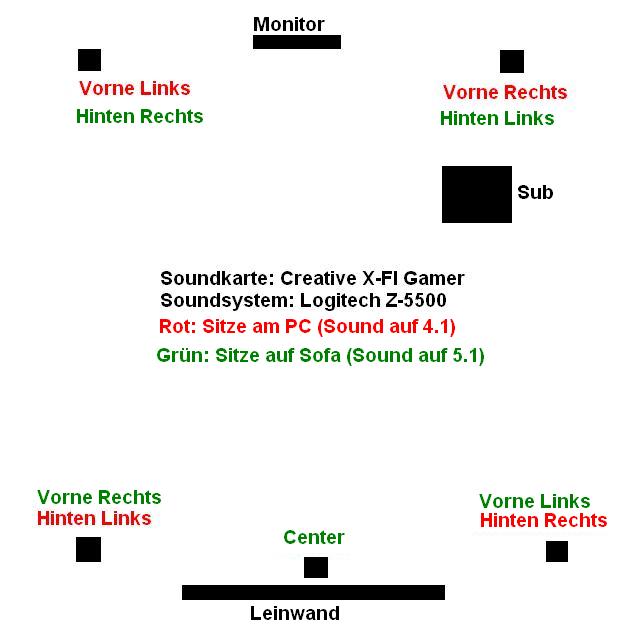 Wenn ich am PC sitze und Musik höre oder Game dann ist meine Soundeinstellung auf 4.1 und das Z-5500 auf 6CH Direct gestellt. Damit der Sound nicht "verkehrt" ist habe ich mit Hilfe der Creative THX-Konsole die Lautsprecher neu zugeordnet. Normal ist das Z-5500 auf die Leinwand ausgerichtet (darum auch der Center Lautsprecher). Nun brauche ich meinen Gamer-PC auch als Media Center. Meine X-FI ist somit per 6CH Direct UND per Optical ans Z-5500 angeschlossen. Zum Musik hören und Gamen brauche ich 6CH Direct, zum Filme schauen Optical.