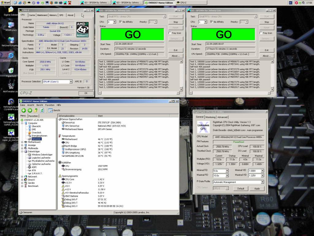 Seit 7 h: 250 MHz x 10 mit 1,424 V -> der X2 braucht anscheinend einfach ein wenig mehr VCore, wobei mit dem Thermalright das auch noch ganz gut geht, immer so zwischen 45°C und 47°C.