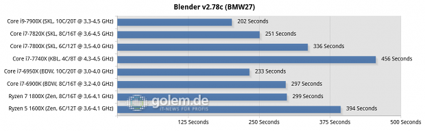Unter Windows hat der Blender Test BMW27 jeweils länger gedauert, 251s statt 244s (+2,8%)auf dem 7820X, 297s statt 277s (+7,2%) beim 6900K und 299s statt 264s (+13,3%) beim R7 1800X, da dürften aber die Taktraten nicht auf 3,6GHz fixiert gewesen sein, und da hat der Skylake-X nun nach mehr Leistungsvorteile. Statt 13,5% und 8% haben die beiden anderen nun rund 19% mehr Zeit gebraucht.