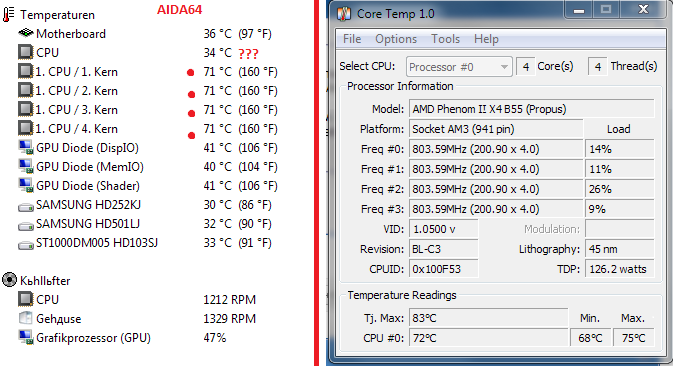 was du mal testen soltest wie warm der kühlkörper in etwa kommt und ob das so in etwa mit den werten die angezeigt werden hinkommt
