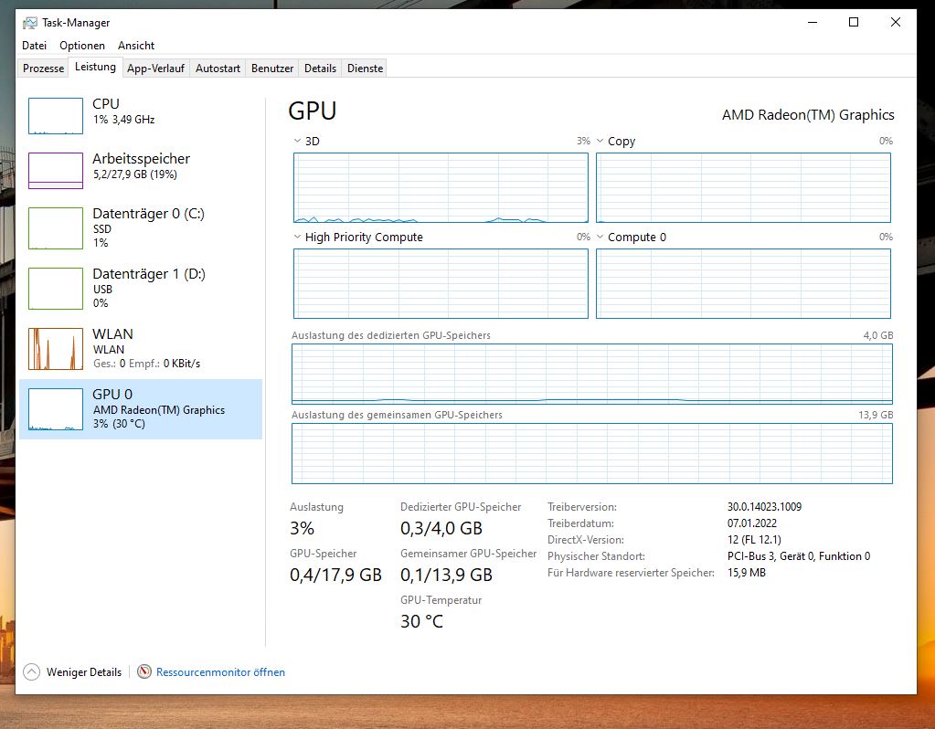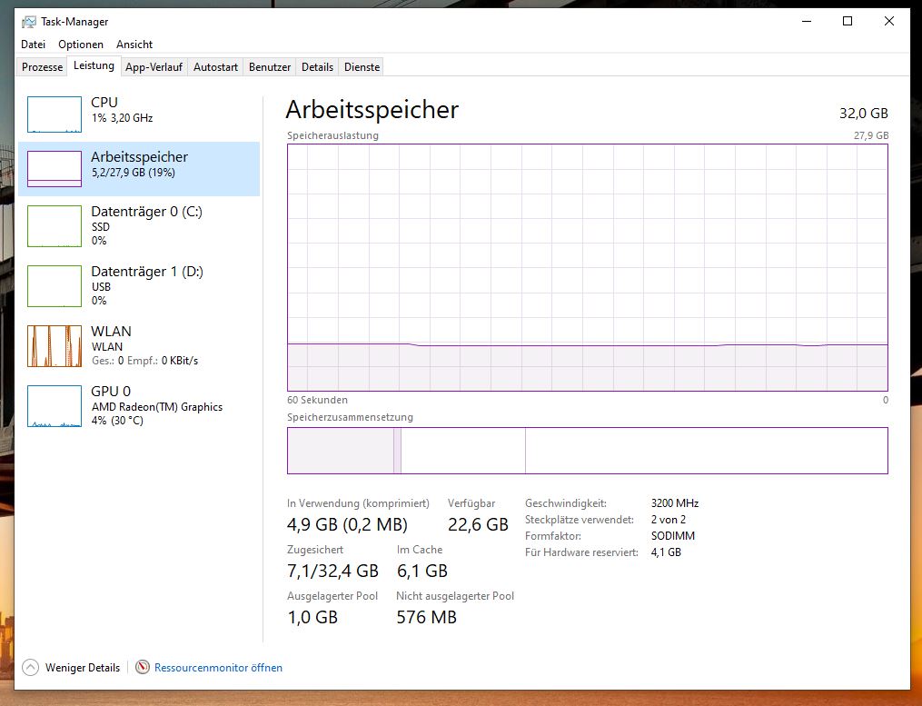 habe heute meinen Deskmini X300 fertig gebaut. Mit 5700G und 32 GB Ram (2x16 GB). Läuft soweit super, allerdings machte mich die Anzeige des verfügbaren Rams im Task Manager stutzig: 27,9 GB von 32 GB Ram verwendbar (siehe Screenshot).