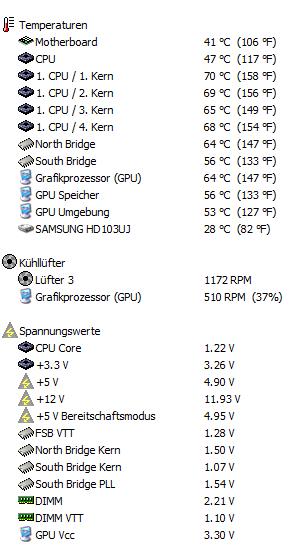 hier mal spannungen unter last und temps (Gehäuse gedämmt und geschlossen):
