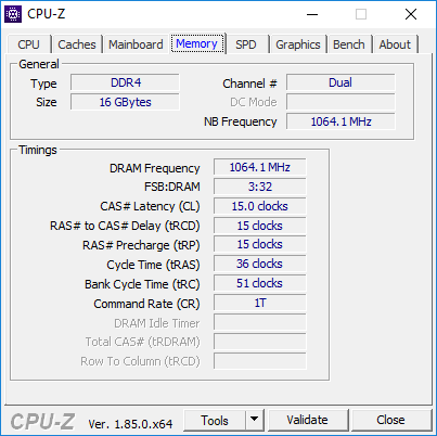 Laut CPU-Z läuft der Speicher im Dual-Betrieb nur auf DDR4-2132 trotz aktiviertem XMP 2.0 Profil (DDR4-3200).