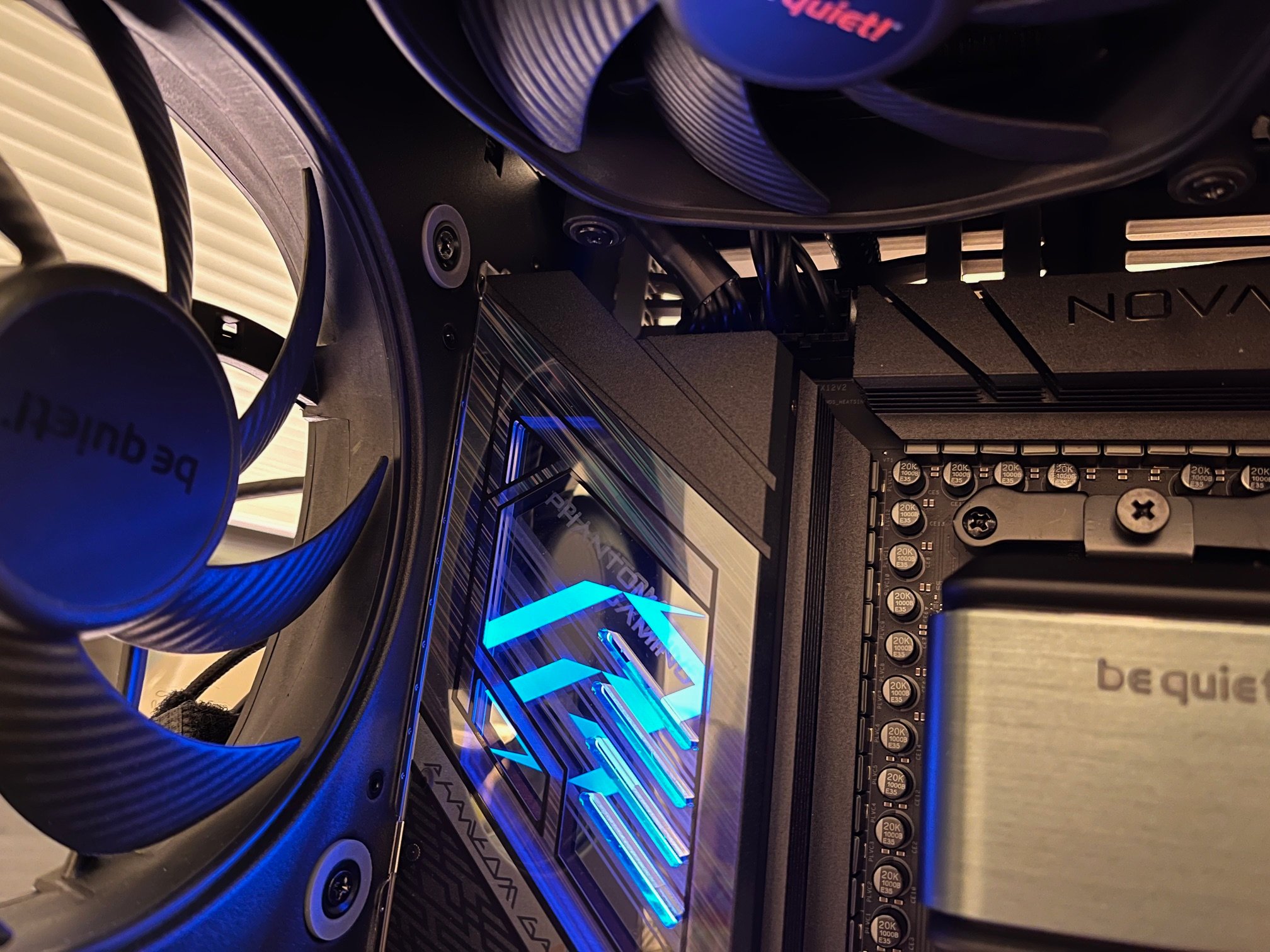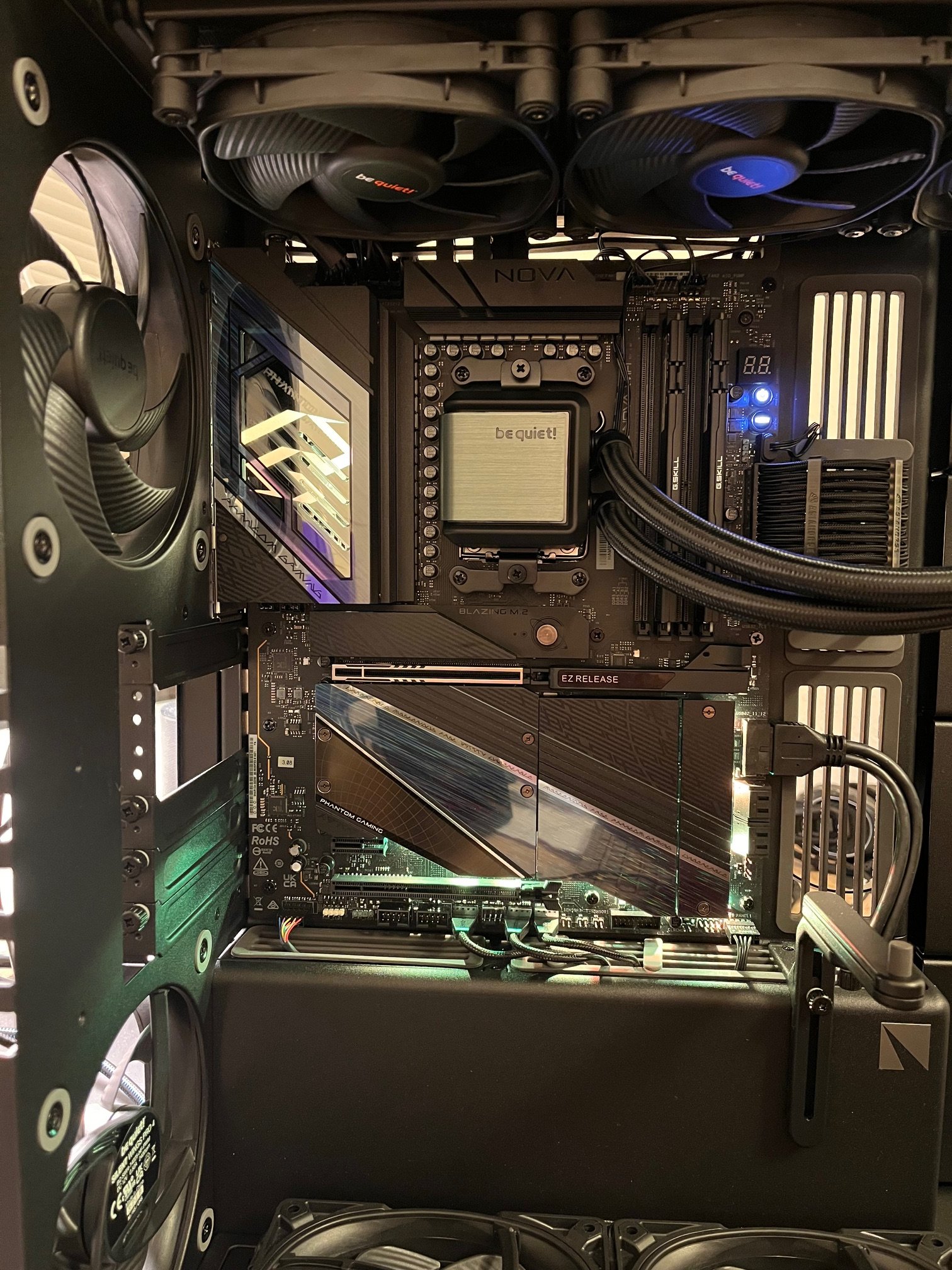 Der PC geht an, die LEDs leuchten, alle Lüfter drehen (bis auf einen, muss ich mir später mal anschauen)