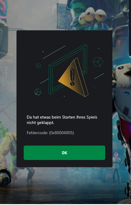 Beim starten erscheint der Fehler "Da hat etwas beim Starten Ihres Spiels nicht geklappt. Fehlercode 0x80004005". ähnlich beim installieren "Ein unerwarteter Fehler ist aufgetreten.. Fehlercode 0x80004005" Siehe Screenshots.