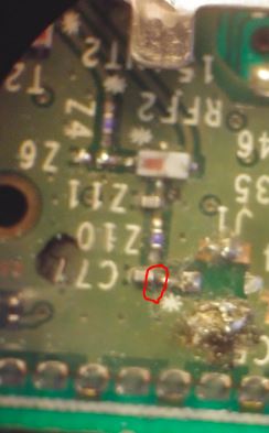 1. PCB prüfen/Schaden anschauen, ggf. sind die Pads/Lötpunkte mit abgerissen. Falls dies der Fall ist, kann direkt an den 0201 Kondensator gelötet werden (rot eingekreist). Fehlt auch der ist eine Reparatur nicht mehr sinnvoll möglich: