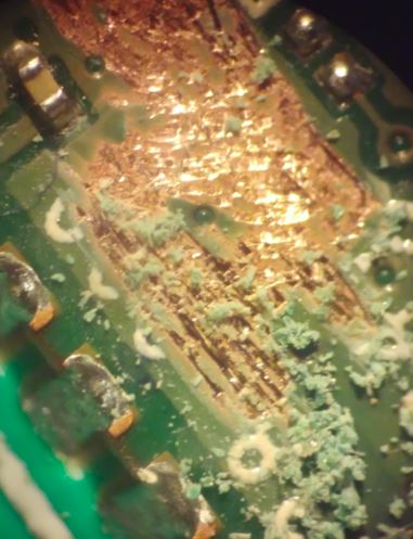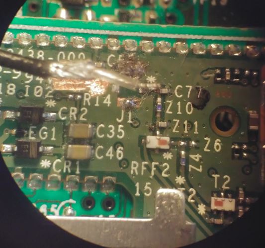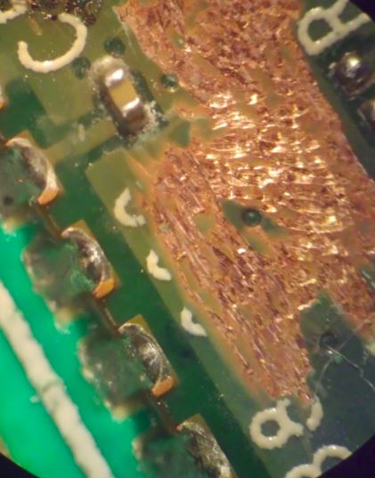 8. Neues Pad freilegen für die Schirmung. Am besten geht dies mit einem stabilen Skalpell. Dazu wird die grüner Lötstopmaske abgekratzt und anschließend der Staub mit Isopropanol und Q-tips entfernt.