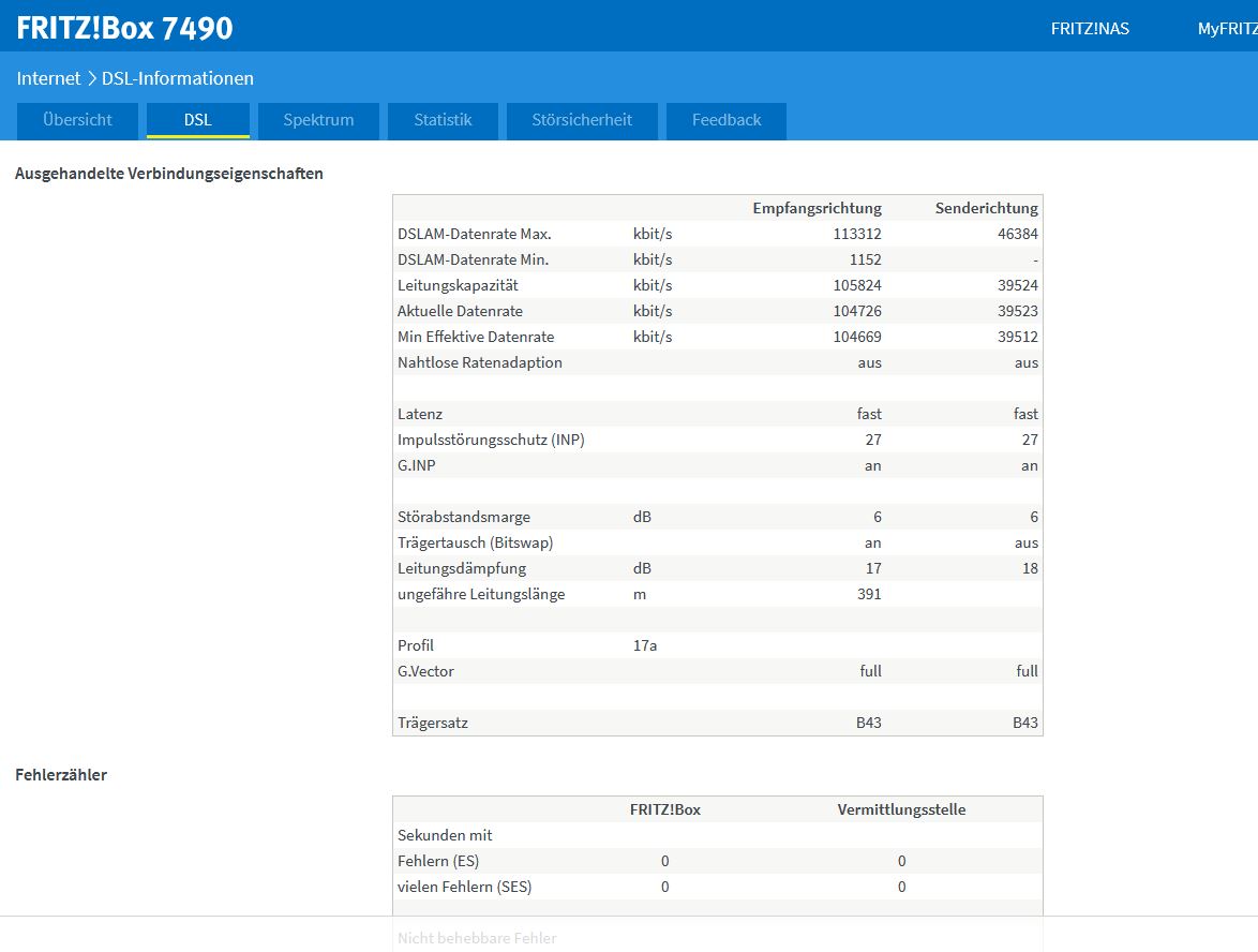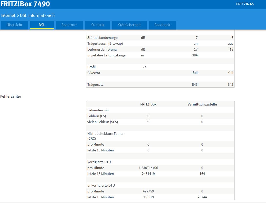 Auffallend ist auch das die Dämpfung offenbar schwankt mal wird 18/18db mal 17/18db angezeigt. Auch die Leitungslänge scheint zu variieren mal sind es 391m mal sind es 384m. Nachbar links hat 340m + 16/17db Störabstand schwankt auch etwas bei mir.