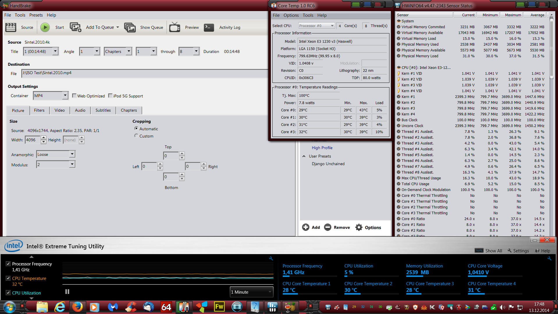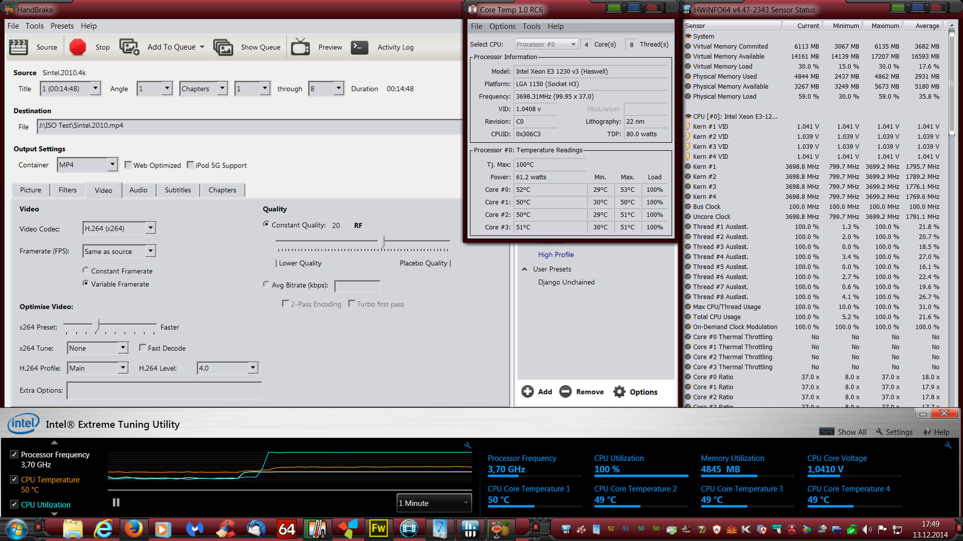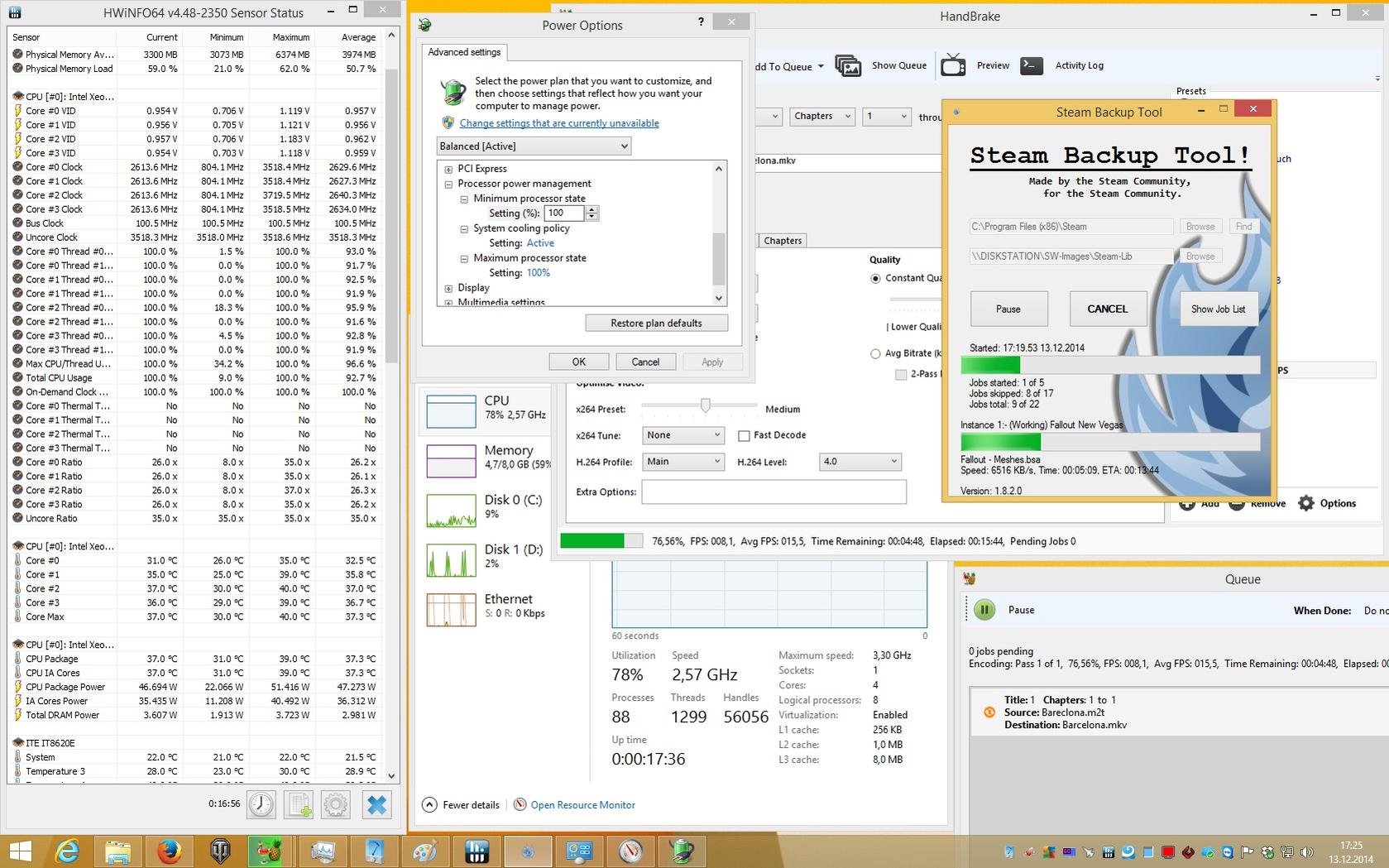 hat jemand eine Idee warum ich beim Transcodieren mit Handbrake bei meinem Xenon E3-1230V3 nur rund 2,5 GHz und nicht die vollen 3,5 (effektiv mit Turob) anliegen haben. Da fehlen ja rund 30% Takt.
