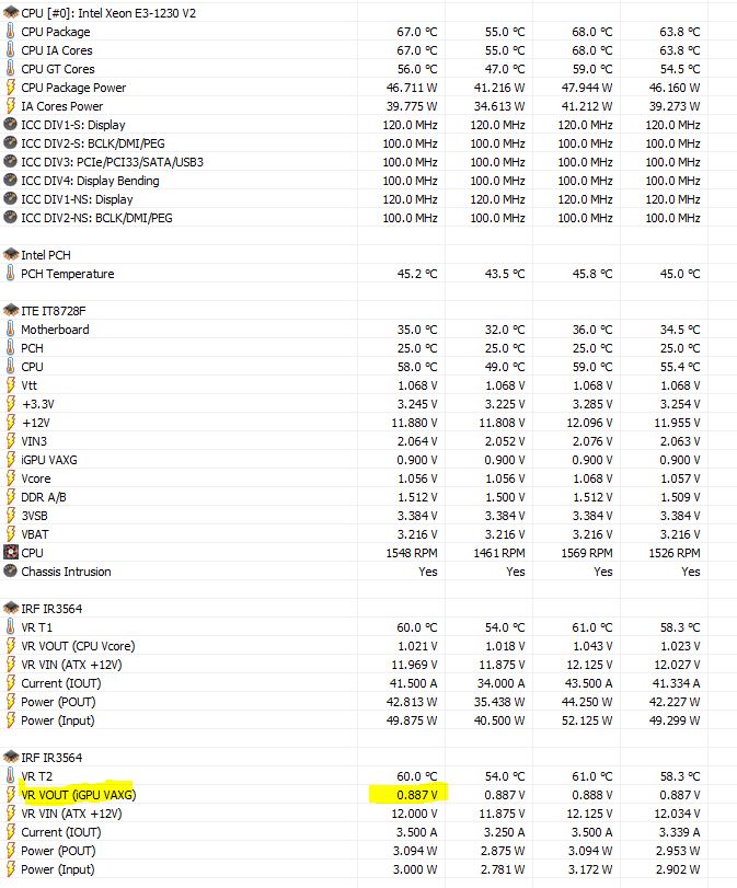 Nun schaue ich spaßeshalber mal die Messwerte in HWiNFO durch und sehe, dass die, eigentlich nicht vorhandene, iGPU mit Spannung versorgt wird.