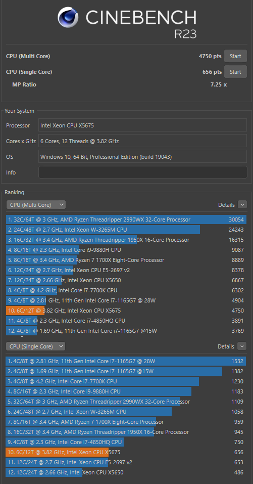 Cinebench Multi und Single siehe Anhang.SirPopelAlot schrieb:Hast du mal einen Benchmark laufen lassen, würde mich mal interessieren, wie gut so eine alte CPU noch abschneidet. Bis vor einiger Zeit hatte ich auch noch ein X5650 am laufen, jedoch gab es immer häufiger Probleme :/