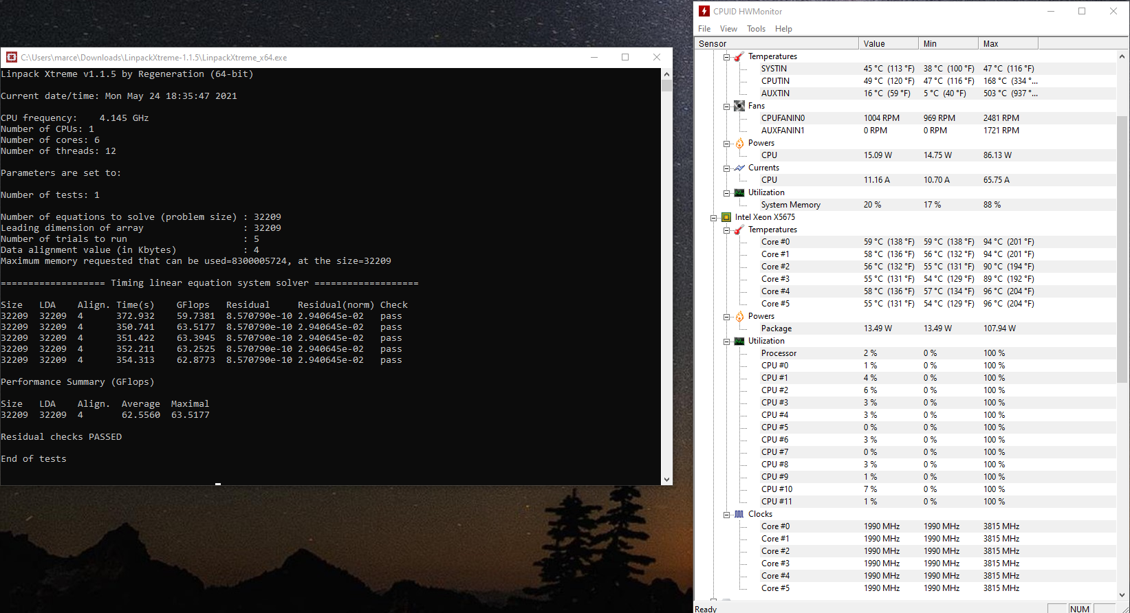 Beim Starten von Linpack fährt er alle Kerne auf 3815 MHz.