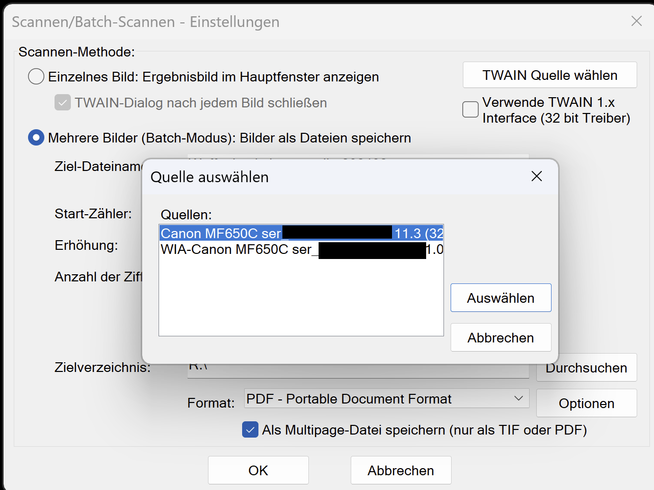 Und wie oben erwähnt, ich bekomme die Canon Twain Treiber nicht mehr wieder drauf. Kann man nur einen Twain Treiber installieren? Es müßten doch auch mehrere Scanner mit Twain Treiber gleichzeitig möglich sein?