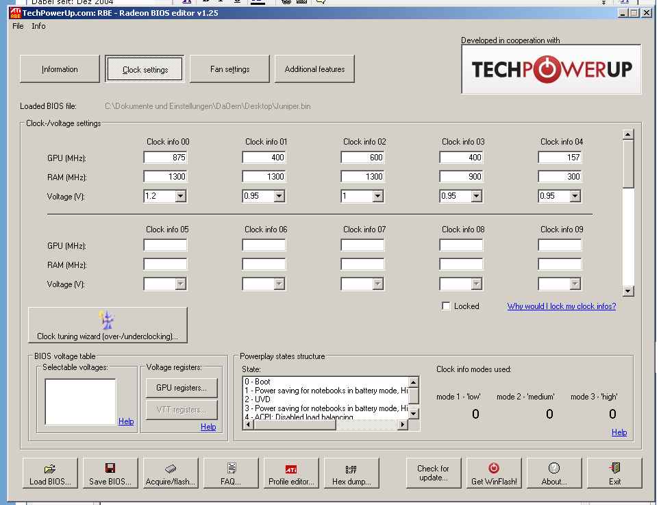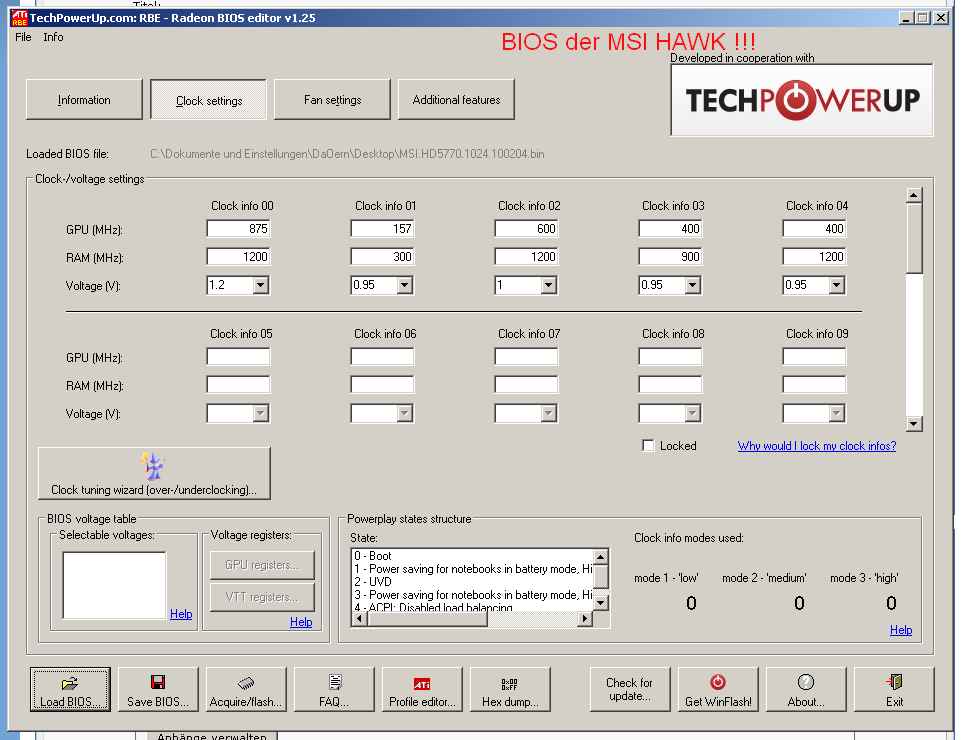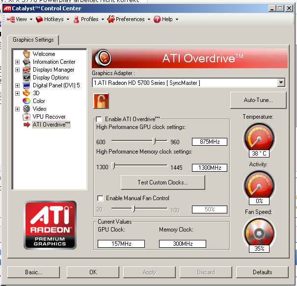 habe heute meine XFX 5770 bekommen. Leider funktioniert Powerplay nicht richtig. Sie läuft im 2D Betrieb mit GPU 400Mhz Memory 1300Mhz. Im Grafikkartebios ist für Powerplay State 5 mit GPU 157Mhz Memory 300 hinterlegt. Das müsste doch dann der 2D Betrieb sein. Treiber ist der aktuellste von ATI, bei XFX gibts den gleichen. Rivatuner funktioniert nicht mit dem Treiber, ATI Tray Tools kann man praktisch nur übertakten mit, runtertakten geht nur ganz minimal. Hat jemand eine Idee? Der Stromverbrauch stieg gegenüber einer 4670 um ca. 25 Watt. Das müssten über 30 Watt Idle sein. Hier noch ein Screenshot: