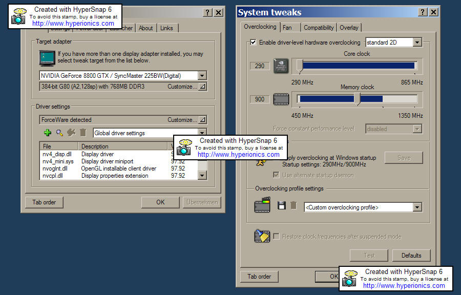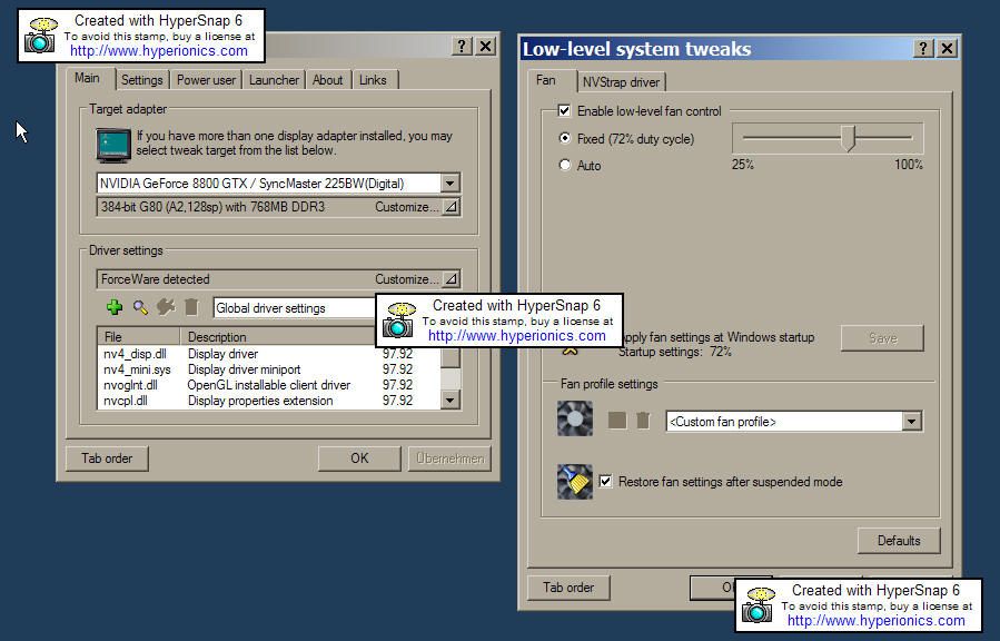 Es gibt noch die Möglichkeit mit RivaTuner V2.0 den 2D-Takt der Karte auf 290MHz GPU zu setzen...bringt einigens an der Temperatur und Stromverbrauch!Gleichzeitig auch den Lüfter von 60% auf 72% setzen...ist dann auch noch nicht zu hören