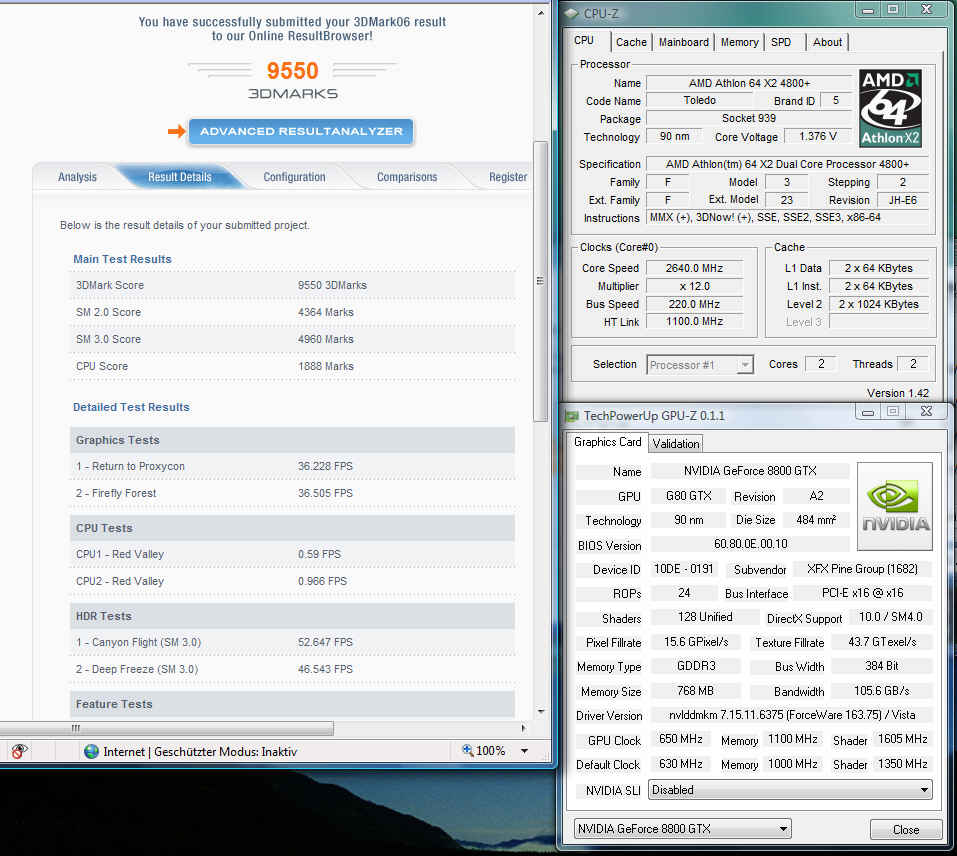 ich habe mal spasseshalber 3D Mark 06 laufen lassen auf meinem System. Die Grafikkarte Standard die CPU und Memory sind mit 10% übertaktet.