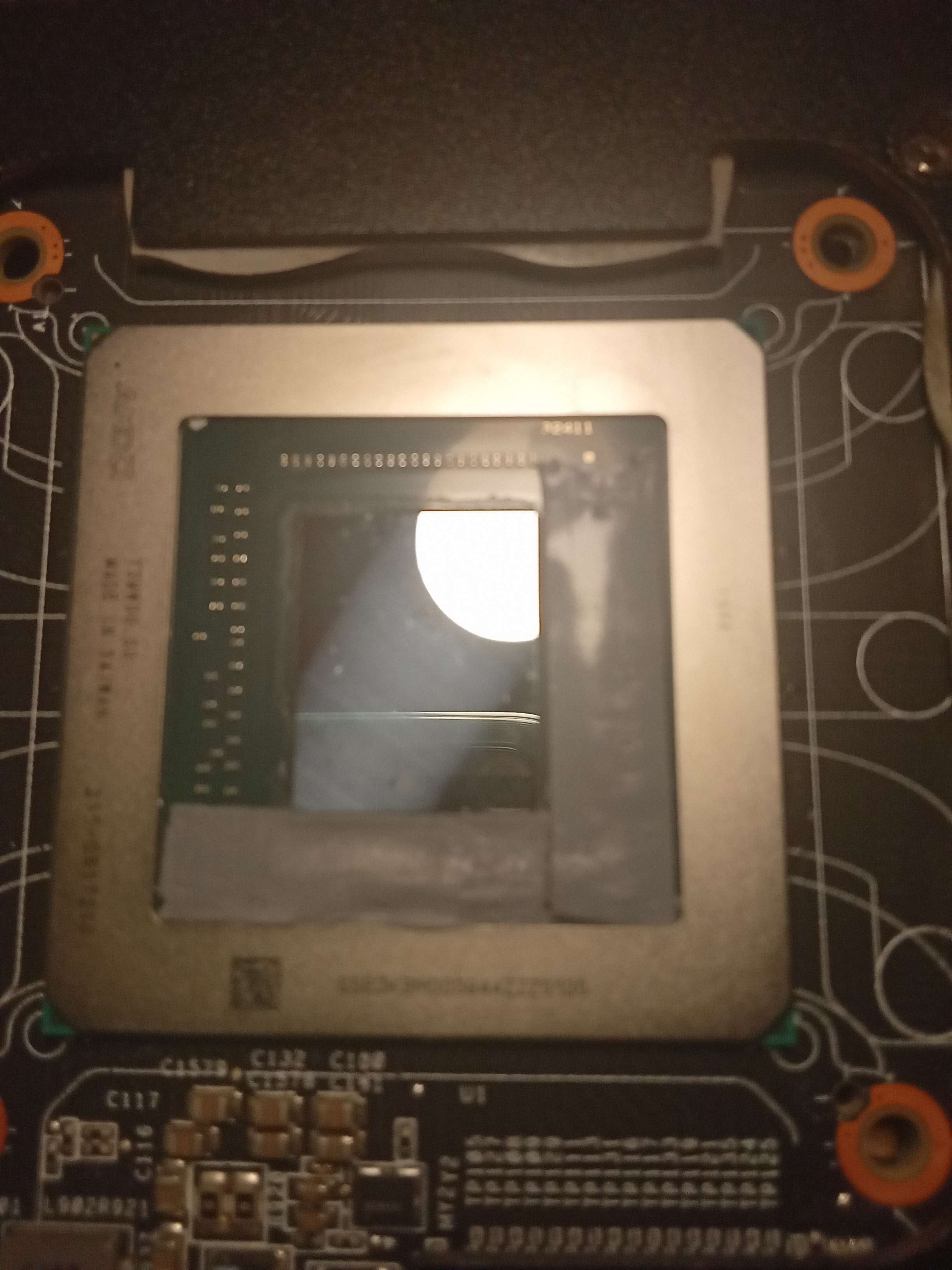 Da direct die , muss man natürlich aufpassen , dass man mit dem leitfähigen Karbonaut nicht an die Kontakte kommt, is klar . Meine Lösung hier : die 0,5 mm Wärmeleitpads (hab welche von gelid solution genommen mit 15 Watt m/k ... die waren recht günstig für das was die können ) zu 4 schmale Streifen schneiden und den Zwischenraum um die gpu die herum damit befüllen (das schließt , zumindest bei der 5700 xt taichi, schon ziemlich genau mit der die bzw dem umliegenden Material ab .