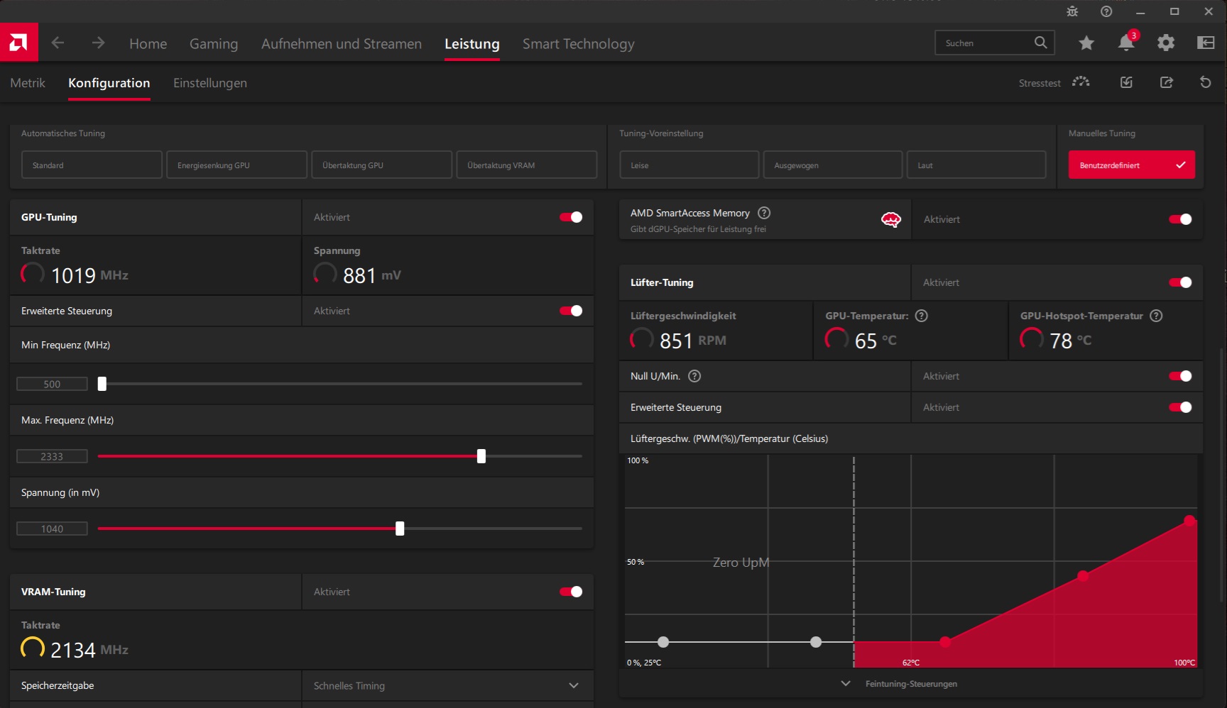 - In Leistung > Konfiguration auf "Benutzerdefiniiert" gestellt und Lüfterkurve angelegt. Dies funktioniert jedoch scheinbar nur, wenn ein Spiel bzw. eine Software explizit ausgewählt wurde. Der Versuch eine generelle Lüfterkurve anzulegen (indem einfach kein Spiel / keine Software) gewählt wird schlug, fehl, da dies von Adrenalin zurückgesetzt wird. Die Karte ist dann zwar absolut lautlos, aber die Temperaturen klettern entsprechend.