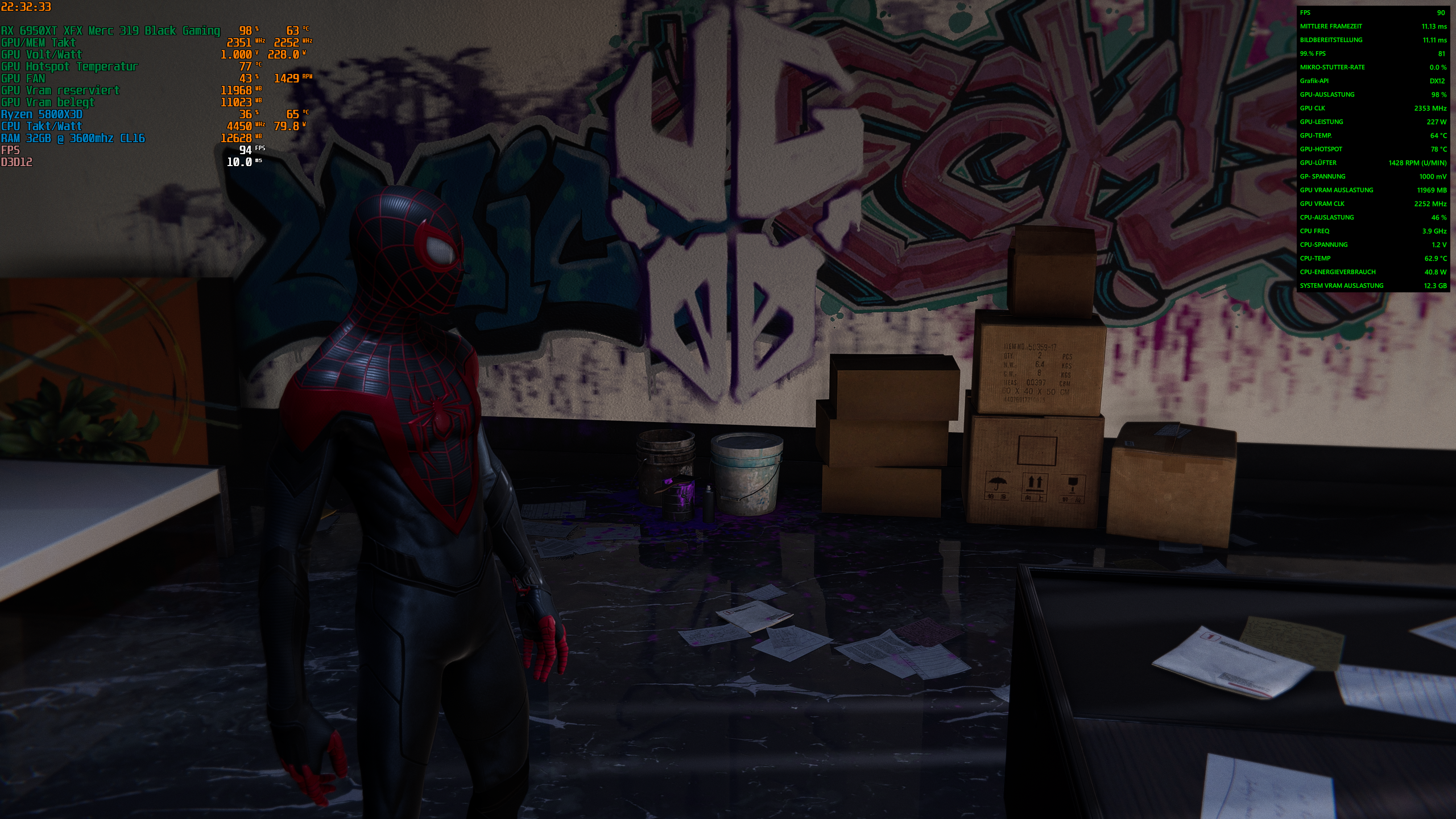 Die Speicherchips auf der 6950XT unterscheiden sich davon dann doch deutlich und ließen sich auf meiner MERC319 auf 2420 MHz übertakten. Eine Empfehlung spreche ich dafür nicht aus, da das Undervolting viel mehr Sinn ergibt. Und zwar konnte ich den Speicher von 1350 mv auf unglaubliche 1175 mv um 175 mv ohne Leistungsverlust untervolten. Das spart ordentlich Energie und Abwärme und ist vorallem eine gute Entscheidung da der Kern kaum noch von weiterer Speicherbandbreite profitiert. In 4K kann das nochmal 1-2 FPS bringen, aber ansonsten fällt der Unterschied in den Bereich der Messgenauigkeit. Im Gegensatz zu den 2000 MHz auf den 6900er Karten (die freigegenen sind, ansonsten ist da bei 2150 MHz Schluss) lohnt es sich nicht den Speichertakt von 2250MHz noch weiter zu erhöhen.