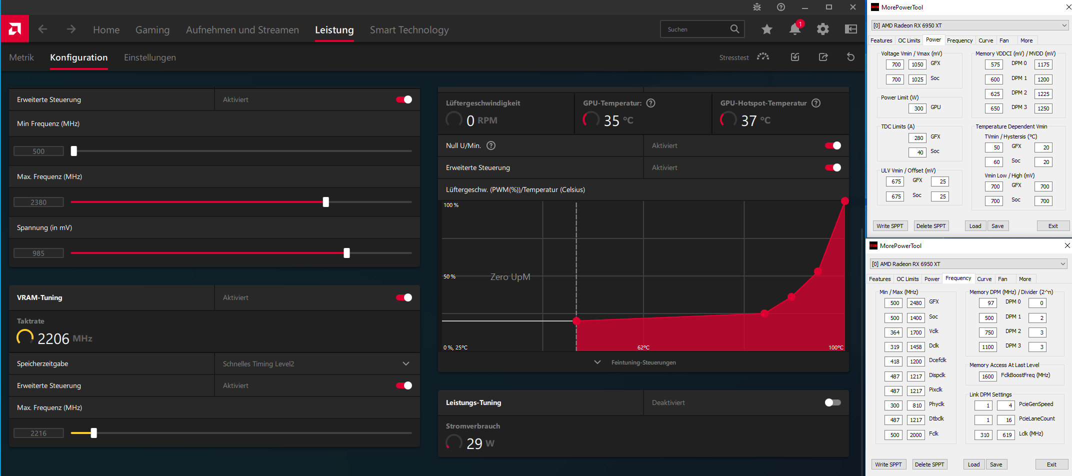 Der Betrieb ist so natürlich unvernünftig und deswegen hier, wie ihr es von mir kennt, auch noch alltagstaugliche Einstellungen vom MPT und Treiber für einen kühlen, leisen, schnellen, aber verhältnismäßig sparsamen Betrieb: