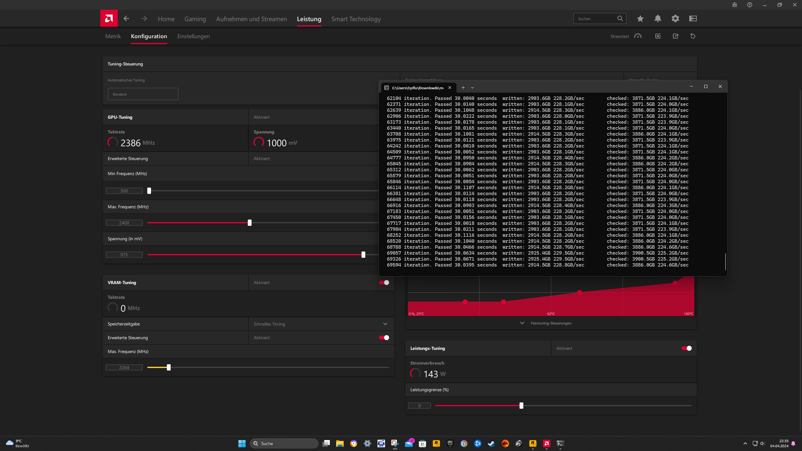 Die Speicherchips auf der 6950XT unterscheiden sich davon dann doch deutlich und ließen sich auf meiner MERC319 auf 2420 MHz übertakten. Eine Empfehlung spreche ich dafür nicht aus, da das Undervolting viel mehr Sinn ergibt. Und zwar konnte ich den Speicher von 1350 mv auf unglaubliche 1175 mv um 175 mv ohne Leistungsverlust untervolten. Das spart ordentlich Energie und Abwärme und ist vorallem eine gute Entscheidung da der Kern kaum noch von weiterer Speicherbandbreite profitiert. In 4K kann das nochmal 1-2 FPS bringen, aber ansonsten fällt der Unterschied in den Bereich der Messgenauigkeit. Im Gegensatz zu den 2000 MHz auf den 6900er Karten (die freigegenen sind, ansonsten ist da bei 2150 MHz Schluss) lohnt es sich nicht den Speichertakt von 2250MHz noch weiter zu erhöhen.