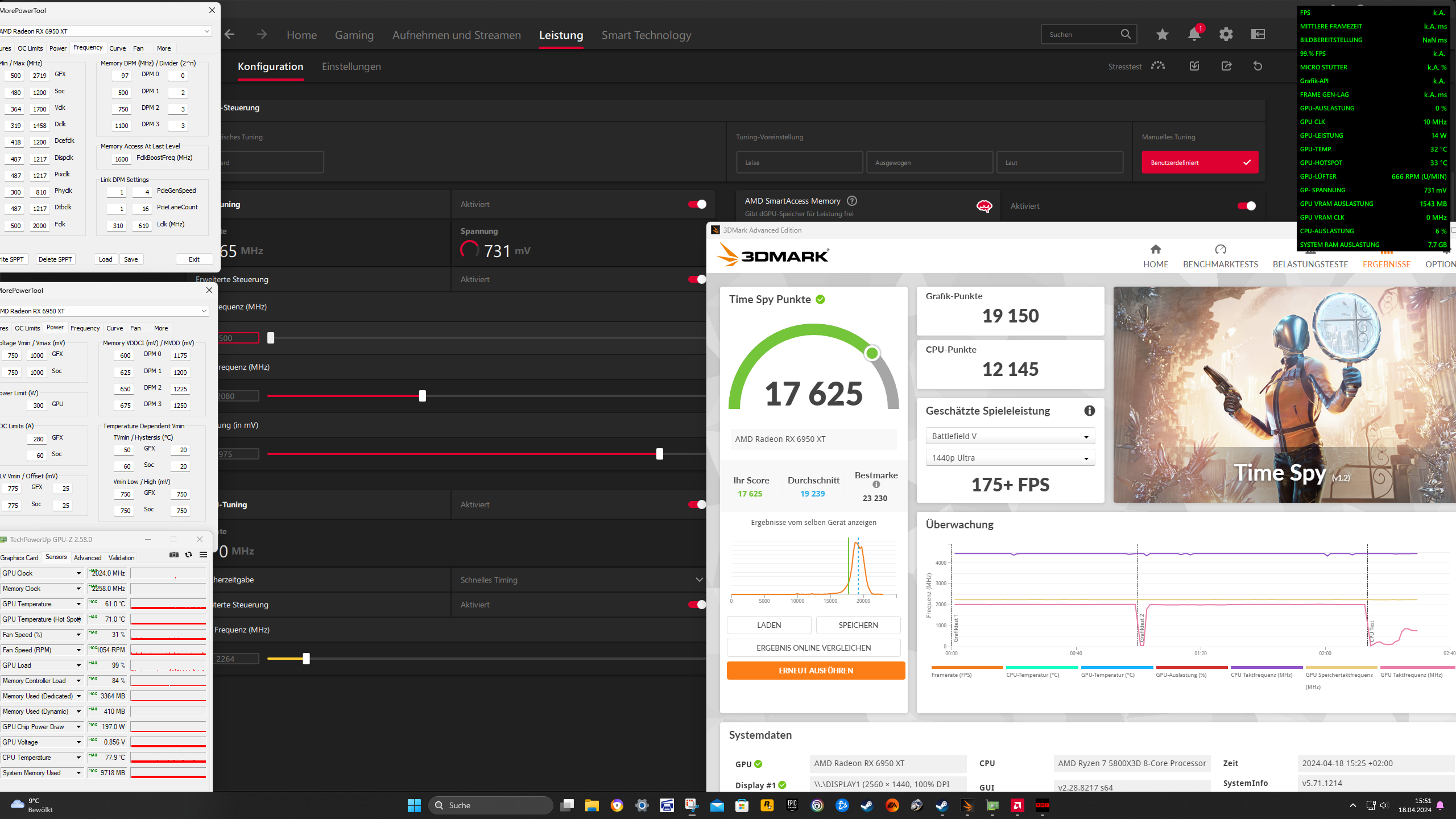 Davon abgesehen ob es sich lohnt, finde ich es aber beeindruckend wie viel besser der Speicher ist und ich musste oft Nachtesten weil ich anfangs meine Ergebnisse nicht geglaubt habe. Beim Übertakten fragte ich mich, wann endlich der Absturz käme und ich war mir nicht sicher ob die eingestellten Taktraten auch übernommen werden. Aber da es mehr Punkte im Benchmark wurden und verschiedene Monitoring Programme den Takt bestätigten, war ich dann beeindruckt wie hoch der Takt tatsächlich ging. Ebenso irritiert war ich bei 2200 MHz auf dem Speicher vom Undervolting. Bei den 6900ern war das beste was ich je bei einer Karte einstellen konnte eine Spannung von 1250 mv bei 2150 MHz, wobei die meisten 1275 oder 1300 mv für diesen Takt brauchen. 1175 mv fielen mir also anfänglich auch schwer zu glauben.