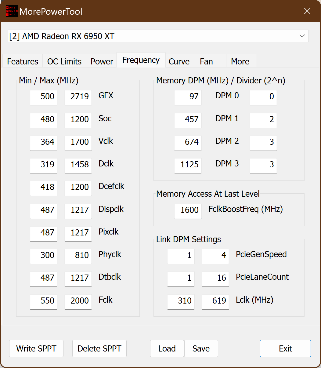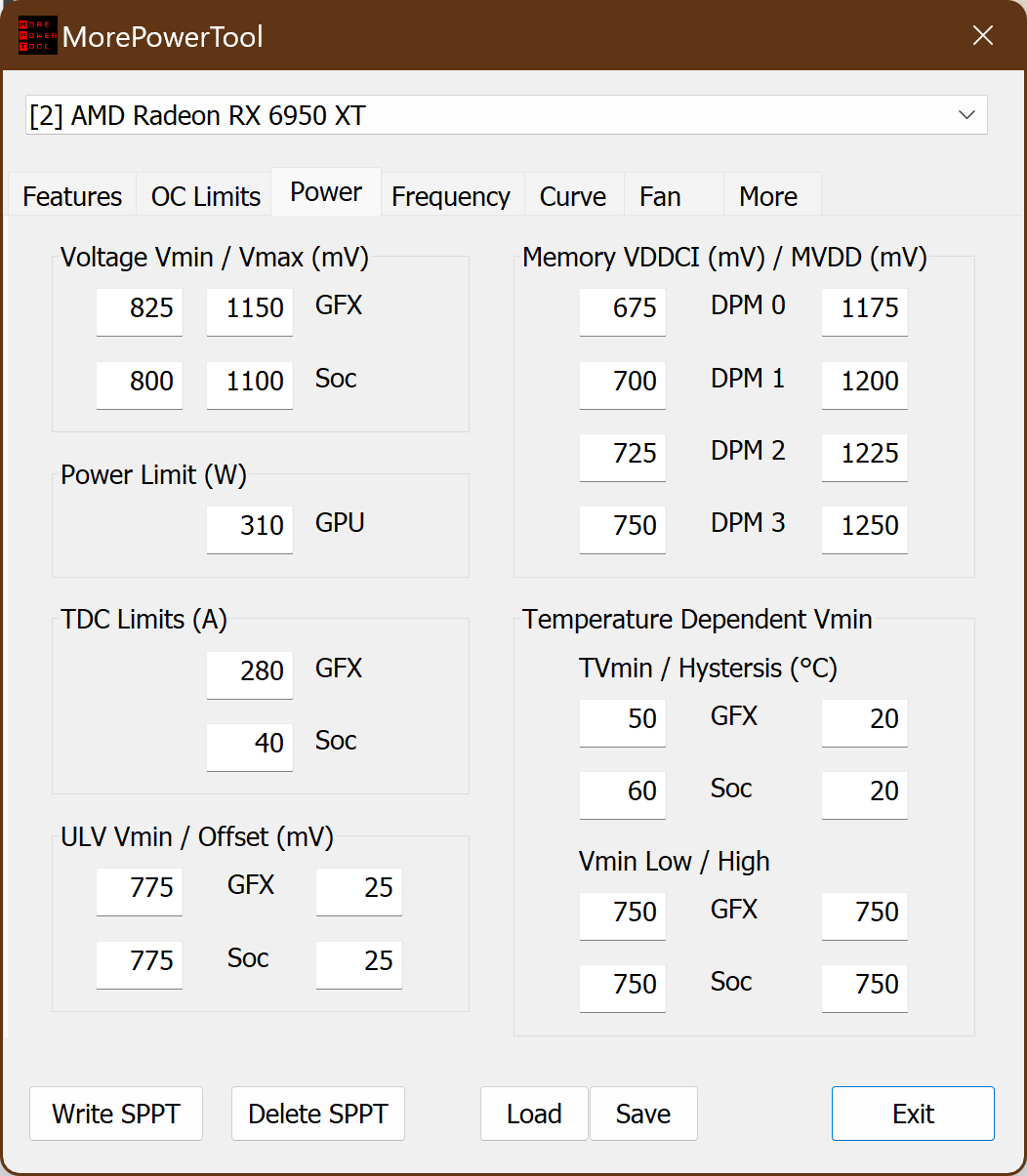 Die Speicherchips auf der 6950XT unterscheiden sich davon dann doch deutlich und ließen sich auf meiner MERC319 auf 2420 MHz übertakten. Eine Empfehlung spreche ich dafür nicht aus, da das Undervolting viel mehr Sinn ergibt. Und zwar konnte ich den Speicher von 1350 mv auf unglaubliche 1175 mv um 175 mv ohne Leistungsverlust untervolten. Das spart ordentlich Energie und Abwärme und ist vorallem eine gute Entscheidung da der Kern kaum noch von weiterer Speicherbandbreite profitiert. In 4K kann das nochmal 1-2 FPS bringen, aber ansonsten fällt der Unterschied in den Bereich der Messgenauigkeit. Im Gegensatz zu den 2000 MHz auf den 6900er Karten (die freigegenen sind, ansonsten ist da bei 2150 MHz Schluss) lohnt es sich nicht den Speichertakt von 2250MHz noch weiter zu erhöhen.