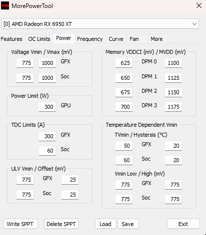 Die Speicherchips auf der 6950XT unterscheiden sich davon dann doch deutlich und ließen sich auf meiner MERC319 auf 2420 MHz übertakten. Eine Empfehlung spreche ich dafür nicht aus, da das Undervolting viel mehr Sinn ergibt. Und zwar konnte ich den Speicher von 1350 mv auf unglaubliche 1175 mv um 175 mv ohne Leistungsverlust untervolten. Das spart ordentlich Energie und Abwärme und ist vorallem eine gute Entscheidung da der Kern kaum noch von weiterer Speicherbandbreite profitiert. In 4K kann das nochmal 1-2 FPS bringen, aber ansonsten fällt der Unterschied in den Bereich der Messgenauigkeit. Im Gegensatz zu den 2000 MHz auf den 6900er Karten (die freigegenen sind, ansonsten ist da bei 2150 MHz Schluss) lohnt es sich nicht den Speichertakt von 2250MHz noch weiter zu erhöhen.