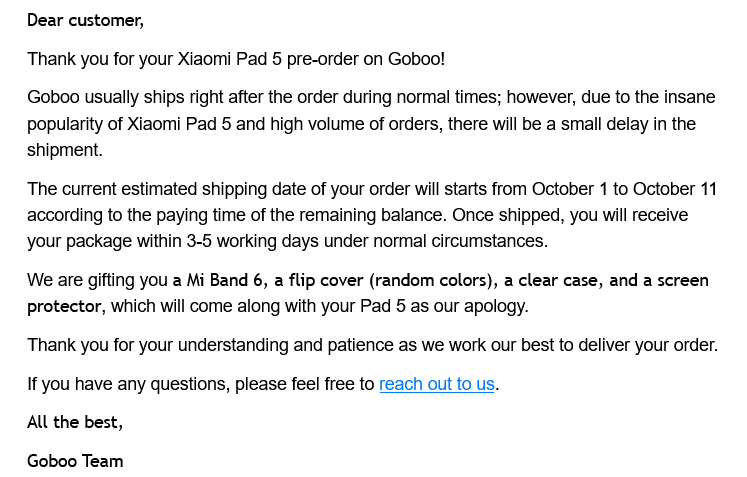 Diese Mail habe ich vorhin auch bekommen. Der Support hatte mir auf meine Anfrage von gestern jedoch geschrieben, dass meines vor dem 01. Oktober verschickt werden soll. Mal sehen. Irgendwie schade, dass es so lange dauert, denn laut PayPal war die Transaktion 30 Sekunden nach 9 Uhr abgeschlossen und goboo hatte versprochen in der Reihenfolge zu versenden, in der die Zahlungen eingehen. Ich hätte lieber eine pünktliche Lieferung als die extra Goodies. Das magnetische Cover habe ich mir bereits selbst bestellt und mit dem Rest kann ich nicht unbedingt etwas anfangen.john.smiles schrieb:
