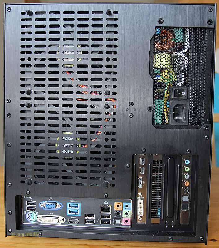 Hinten haben wir Öffnungen für zwei 120mm Lüfter. Das I/O-Shield und vier Slots für Erweiterungskarten. Keine Öffnungen für eine Schlauchdurchführung einer Wasserkühlung, aber es wäre auch kein vernünftiger Platz dafür vorhanden.