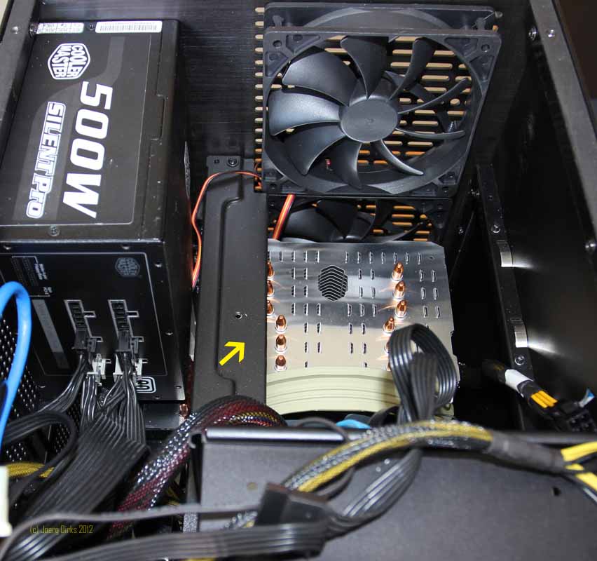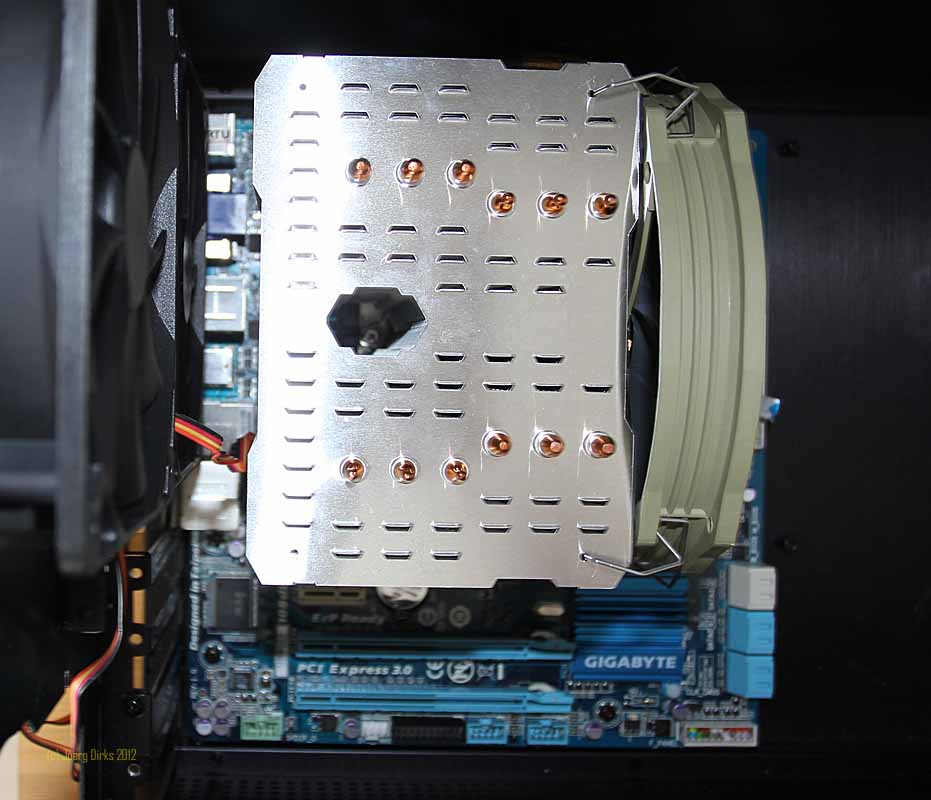 Wie diese Bild zeigt, ist zwischen den vorderen Lüftern und dem CPU-Kühlern ein schöner Freiraum, wo die Luft ungehindert strömen kann, anstatt durch einen dort befindlichen Festplattenkäfig aufgehalten zu werden. Der Lüfter auf dem Macho kann sich so ideal mit Frischluft versorgen.