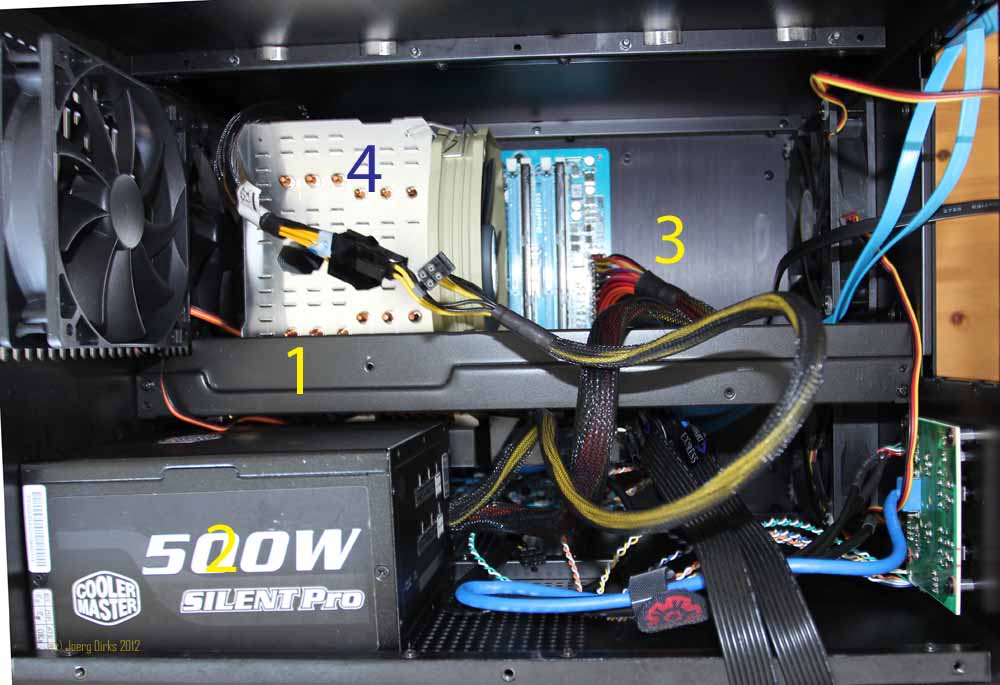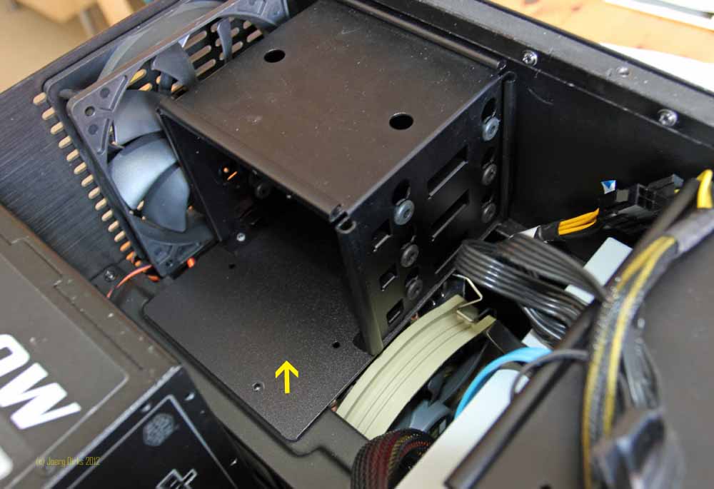 Er wirkt wie eine Wand. Der Boden des 3,5“ Festplattenkäfigs ist eine massive Platte ohne Luftdurchlass. Auch sonst zeigt sich das Teil nicht sehr luftstromförderlich. Ich frage mich ernsthaft, wie der obere Gehäuselüfter da vernünftig Luft absaugen soll. Das würde die 70°C erklären, die ich beim ersten Versuch erreichte, von der Geräuschkulisse ganz zu schweigen. Mit den Scythelüftern beim zweiten Einbauversuch wurde es besser, aber dafür sorgten Verwirbelungen für deutlich hörbare Lüftströmungsgeräusche. Das erklärt vielleicht, warum die Originallüfter so schwach sind: Bei starken Luftstrom hört man denselben nämlich. Ein Schelm, wer Böses dabei denkt.