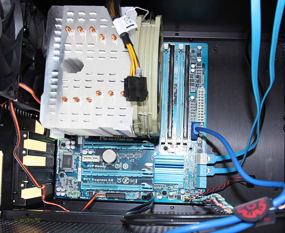 Zum Schluss wird nun der Laufwerkskäfig wieder montiert. Die Festplatten und der Brenner an die SATA-Kabel und die Stromanschlüsse angeschlossen und dann sollte man sich ein wenig mit dem Kabelmanagement beschäftigen. Dafür ist nur wenig Platz vorhanden. Hinter dem Netzteil ist dabei der Beste und meiste Platz für die Kabel. Mittels Kabelbinder, am besten welche mit Klettverschluss, wegen des häufigen nachjustierens, solltet Ihr die Kabel so hinter dem Netzteil verstauen, dass die Kabel nicht in die Lüfter geraten.