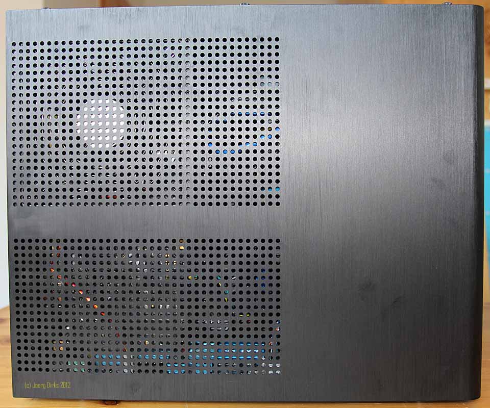 Schauen wir auf die linke Seite des Gehäuses. Die ist mit Luftöffnungen versehen. Unten kann die Grafikkarte atmen, oben das Netzteil frische Luft ansaugen.